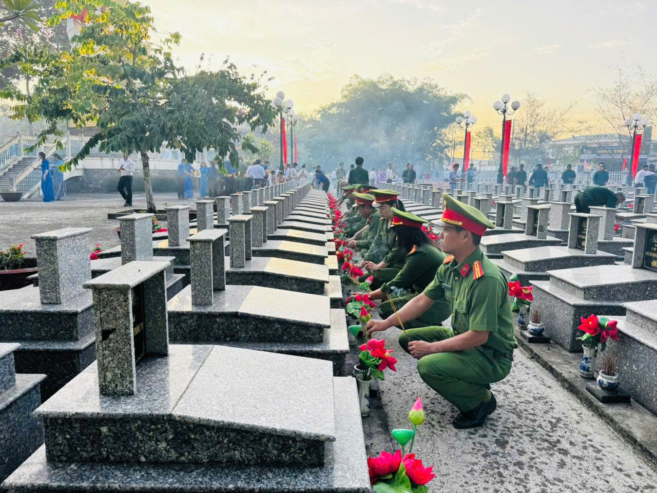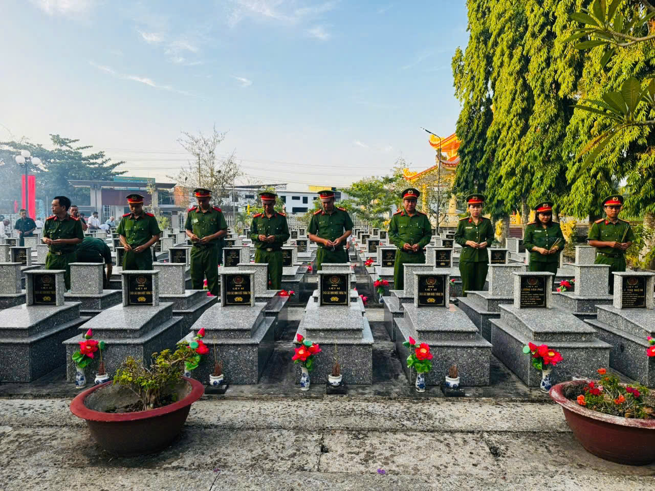 Cán bộ, chiến sĩ Công an xã Thạnh Xuân thắp hương tri ân tại các mộ phần liệt sĩ.