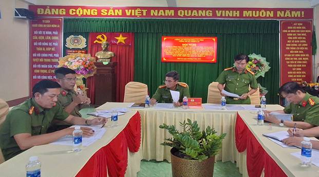 Đồng chí Trung tá Huỳnh Quan Đảo – Phó trưởng Công an xã thông qua các báo cáo