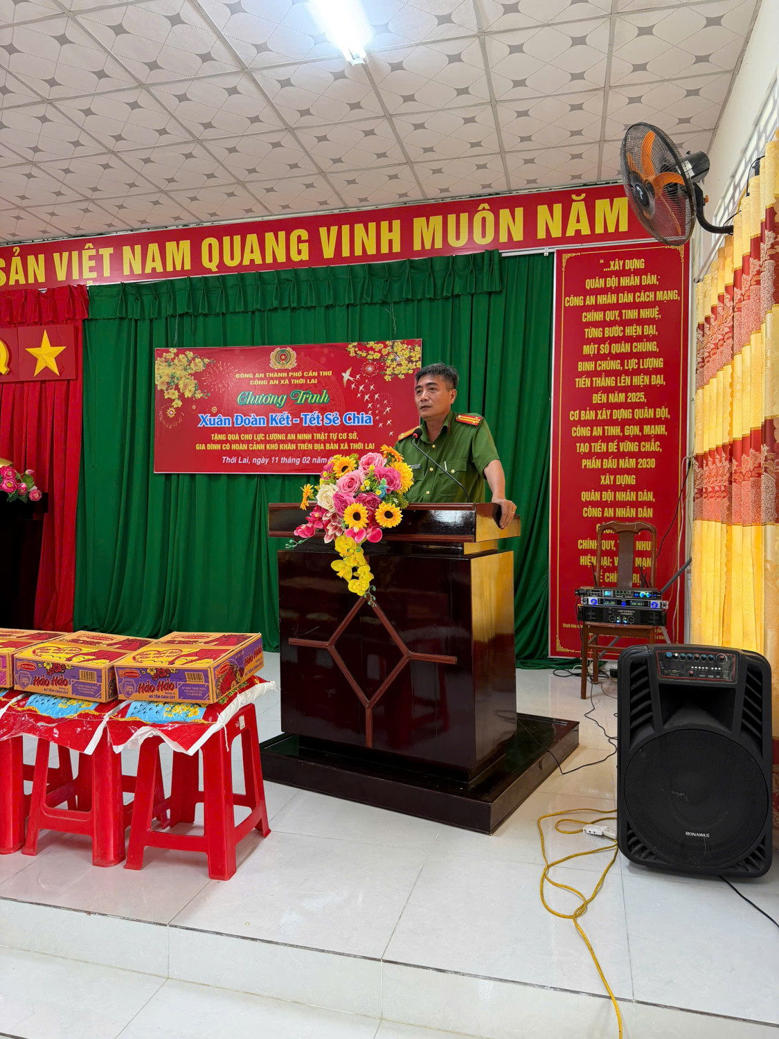 Phát biểu tại chương trình, đồng chí Trung tá Trương Hồng Tiến, Trưởng Công an xã Thới Lai nhấn mạnh: Thực hiện phong trào thi đua “Ba nhất”, lấy nội dung “Gần dân nhất” làm trọng tâm, Công an xã Thới Lai mong muốn thông qua chương trình sẽ góp phần lan tỏa tinh thần đoàn kết, tương thân tương ái, để mọi người, mọi nhà đều có điều kiện vui Xuân, đón Tết. Đồng thời khẳng định, tuy giá trị vật chất của các phần quà không lớn nhưng thể hiện tấm lòng tri ân, sự sẻ chia và trách nhiệm của lực lượng Công an đối với Nhân dân và lực lượng tham gia bảo đảm an ninh, trật tự tại cơ sở.