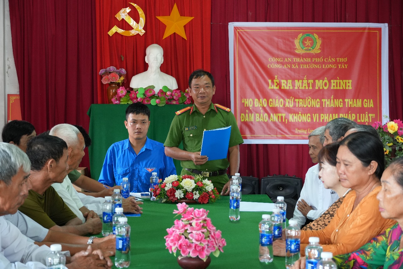 Phát biểu tại buổi lễ, Chỉ huy Công an xã Trường Long Tây kêu gọi toàn thể bà con giáo dân Giáo xứ Trường Thắng tiếp tục phát huy truyền thống tốt đẹp, tích cực hưởng ứng và cùng với Công an xã tham gia thực hiện mô hình bằng những hành động cụ thể, thiết thực, tích cực tham gia các phong trào thi đua yêu nước, sống “tốt đời, đẹp đạo”; phối hợp chặt chẽ với lực lượng Công an xã trong việc trao đổi thông tin, giải quyết có hiệu quả các vụ việc phát sinh ngay từ cơ sở, góp phần đảm bảo an ninh trật tự, xây dựng quê hương ngày càng giàu đẹp.