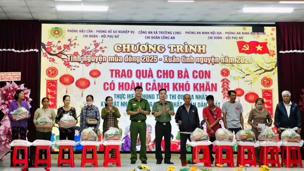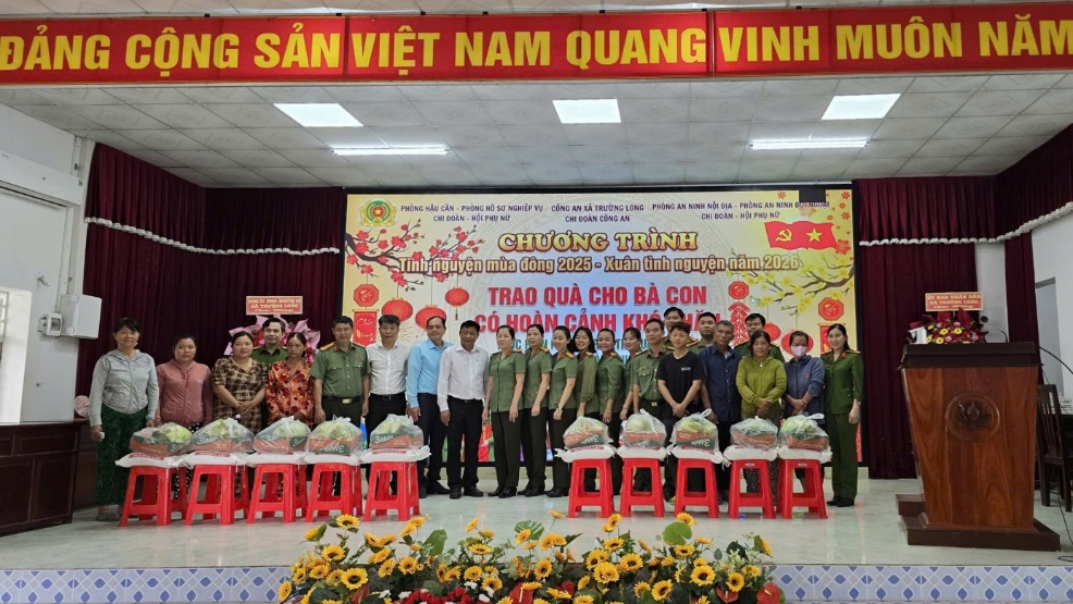 Trong không khí trang nghiêm, đoàn đã dâng hương, dâng hoa tưởng nhớ các anh hùng liệt sĩ đã anh dũng hy sinh trong sự nghiệp đấu tranh bảo vệ Tổ quốc, làm nên chiến thắng Ông Hào vang dội, góp phần giải phóng dân tộc. Đây là đợt sinh hoạt chính trị sâu rộng, nhắc nhở mỗi cán bộ, chiến sĩ Công an xã về đạo lý "Uống nước nhớ nguồn", tiếp thêm động lực phấn đấu hoàn thành xuất sắc nhiệm vụ được giao. Tiếp nối khí thế đó, nhằm phát huy tinh thần xung kích của tuổi trẻ và thực hiện thắng lợi phong trào thi đua “Ba nhất: Kỷ luật nhất - Trung thành nhất - Gần dân nhất”; ngày 05/02/2026, Chi đoàn Công an xã Trường Long đã phối hợp với Đoàn Thanh niên - Hội phụ nữ Phòng Hậu cần, Phòng Hồ sơ nghiệp vụ, Phòng An ninh đối ngoại và Phòng An ninh nội địa tổ chức Chương trình “Tình nguyện mùa đông 2025 - Xuân tình nguyện năm 2026”. Tại chương trình, đoàn đã trao tặng 50 phần quà nghĩa tình với tổng trị giá 20 triệu đồng cho bà con có hoàn cảnh khó khăn trên địa bàn. Những phần quà này không chỉ mang giá trị vật chất mà còn là tấm lòng, sự sẻ chia của lực lượng Công an nhân dân theo phương châm “Lúc dân cần, lúc dân khó, có Công an”, góp phần thắt chặt tình quân dân thắm thiết.