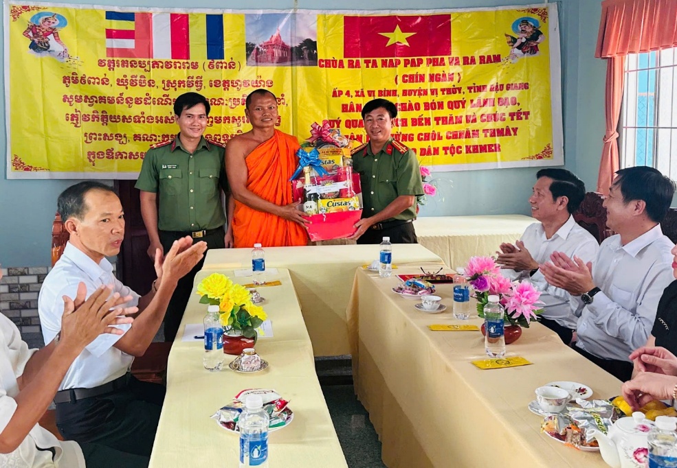 Thượng tá Nguyễn Phi Khanh, Trưởng Công an xã, tặng quà Tết cho đại diện Chùa Ratana Paphia Vararam