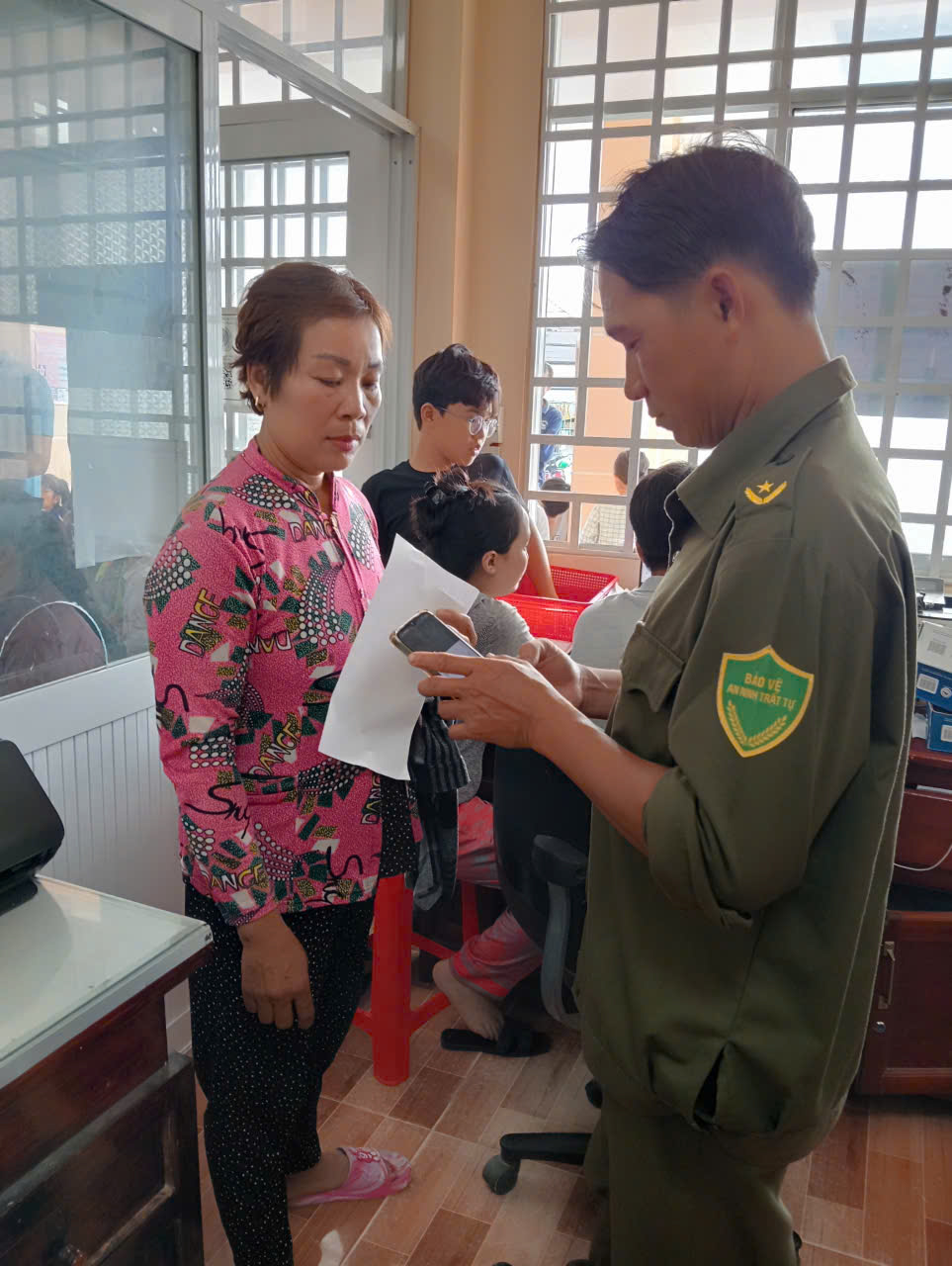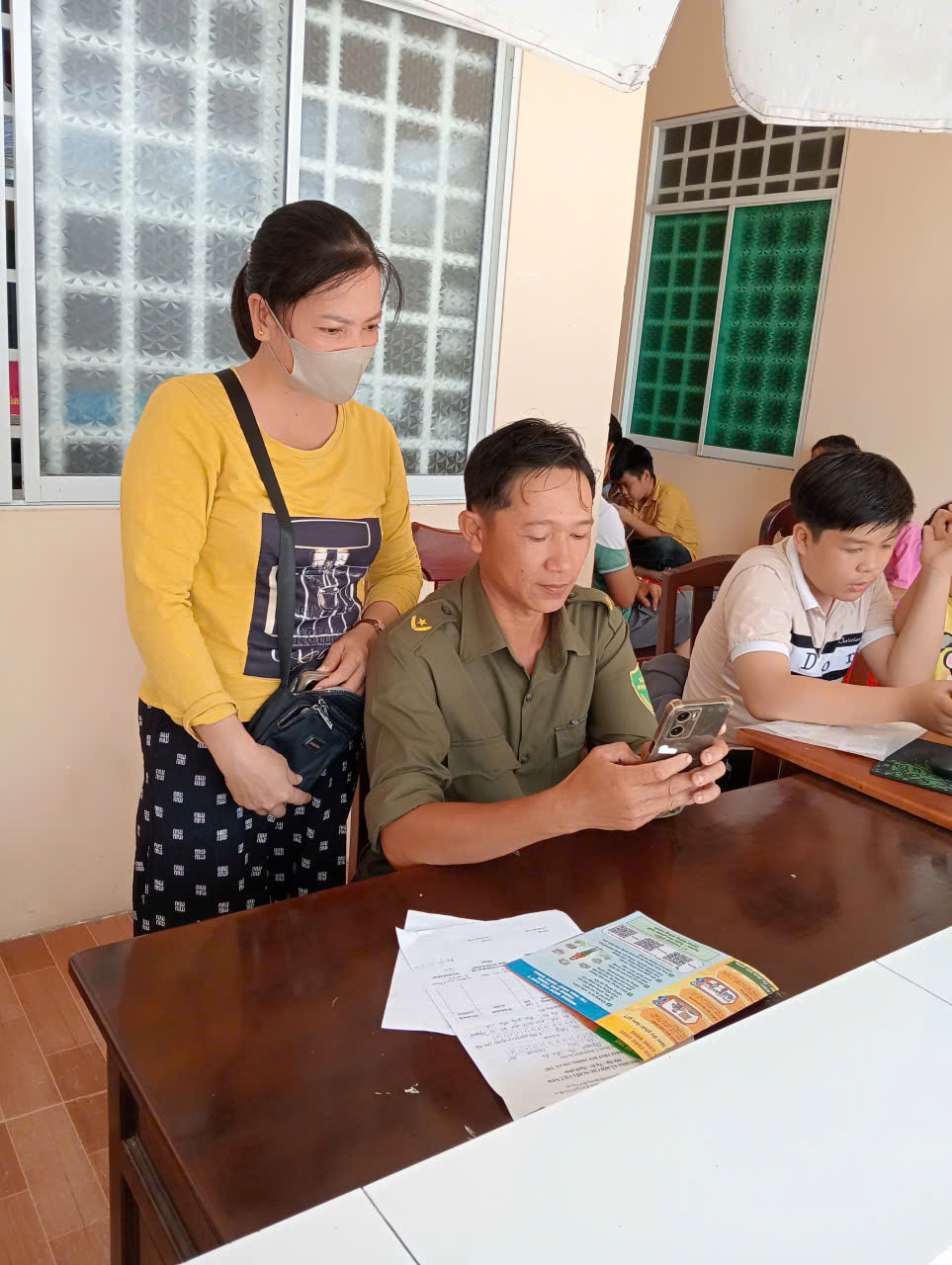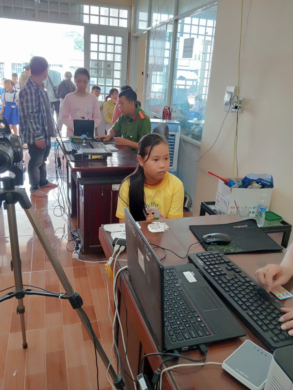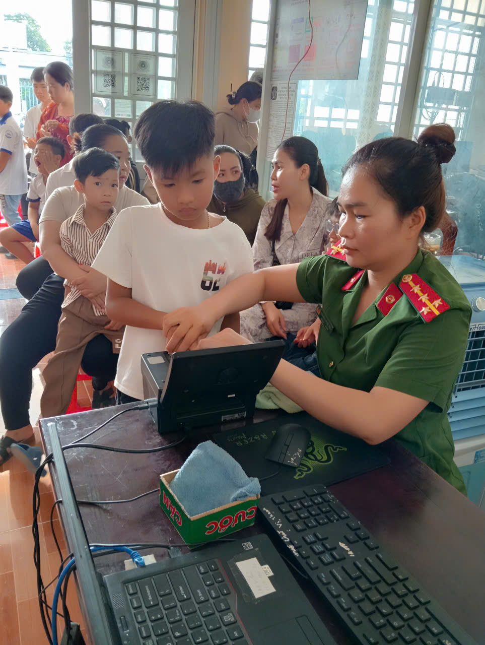 Phụ huynh và các bé tại Tổ Cảnh sát khu vực thực hiện công tác cấp căn cước và đăng ký định danh điện tử