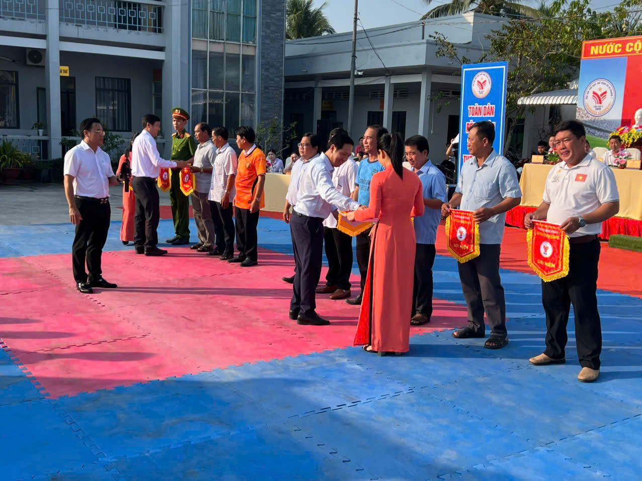 Ông Nguyễn Văn Diên, Bí thư Đảng ủy, Chủ tịch Hội đồng nhân dân xã trao các giải thưởng cho Công an xã, các tập thể, cá nhân đạt thành tích tham gia Đại hội thể dục thể thao xã Vị Thanh 1 lần thứ X năm 2026