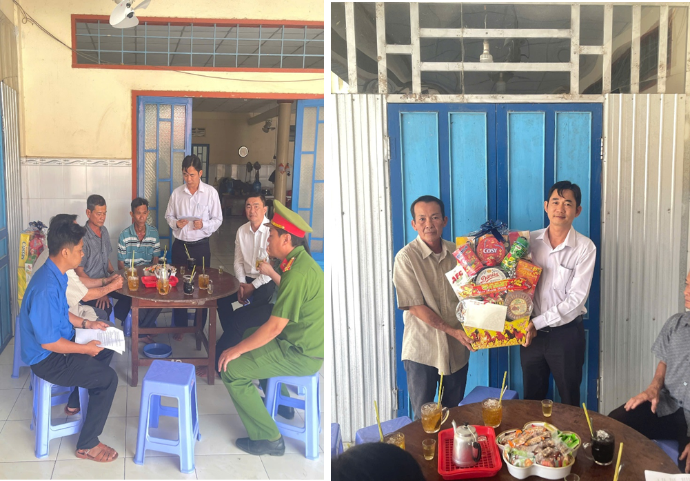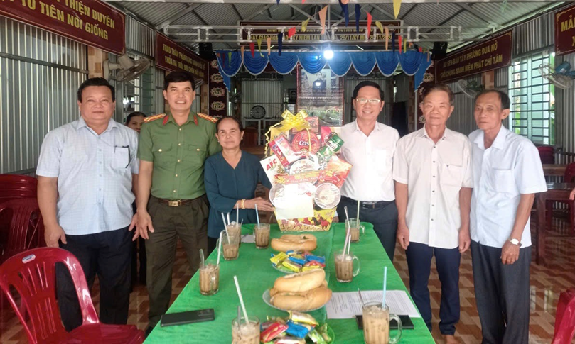Đồng chí Nguyễn Thành Kế, Chủ tịch Ủy ban nhân dân xã cùng đoàn công tác tặng quà Tết đại diện Chi hội Hưng Phước Tự.