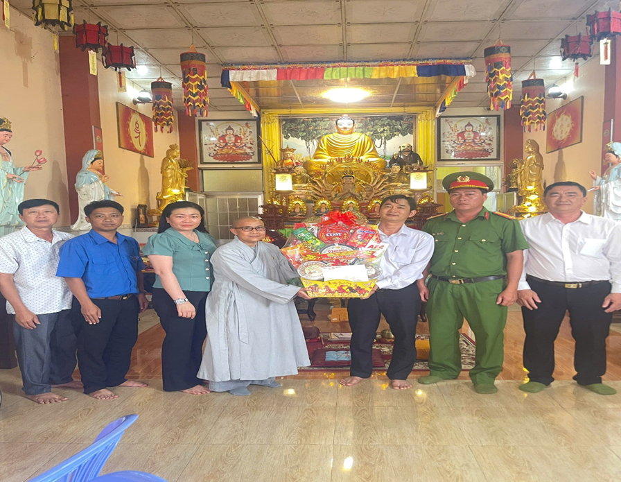 Đồng chí Nguyễn Thành Kế, Chủ tịch Ủy ban nhân dân xã cùng đoàn công tác tặng quà Tết đại diện Chùa Thiền Lâm