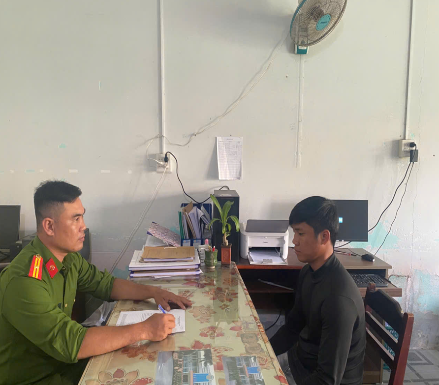 Cán bộ Công an xã Vị Thủy làm việc với đối tượng truy nã.