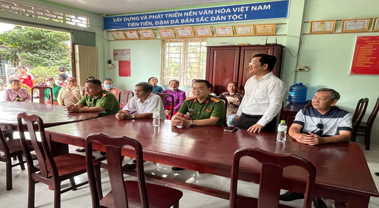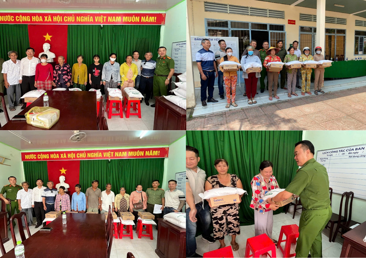 Lãnh đạo Đảng ủy xã, Ban Chỉ huy Công an xã và mạnh thường quân trao quà cho người dân có hoàn cảnh khó khăn.