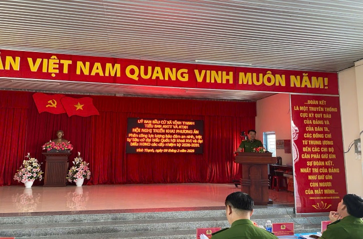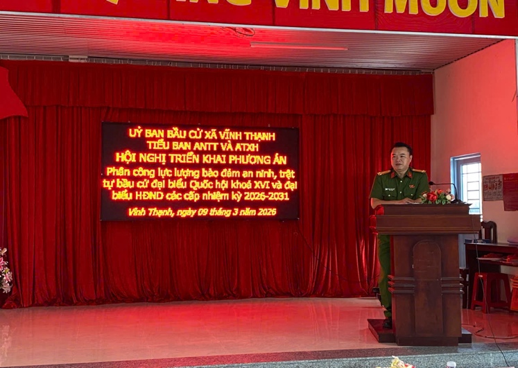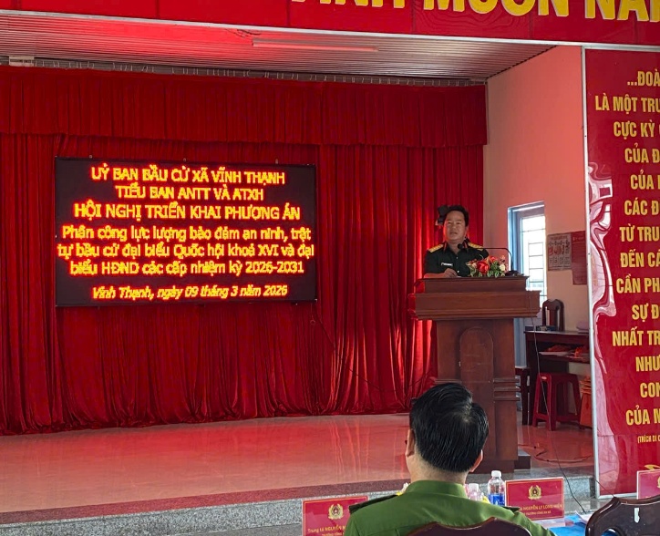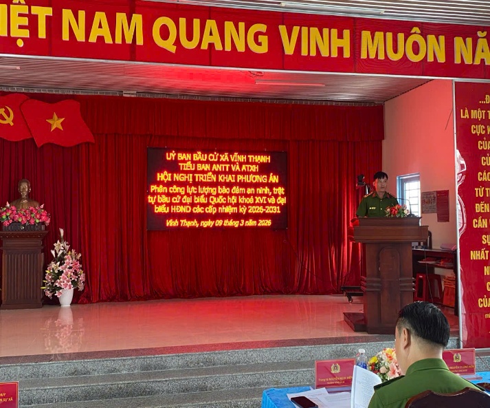 Thực hiện chỉ đạo của Giám đốc Công an thành phố Cần Thơ về phân công lực lượng bảo đảm an ninh, trật tự phục vụ bầu cử đại biểu Quốc hội khóa XVI và đại biểu Hội đồng nhân dân các cấp nhiệm kỳ 2026 – 2031, ngày 09/3/2026, Công an xã Vĩnh Thạnh, thành phố Cần Thơ tổ chức Hội nghị triển khai công tác bảo đảm an ninh, trật tự phục vụ bầu cử trên địa bàn.