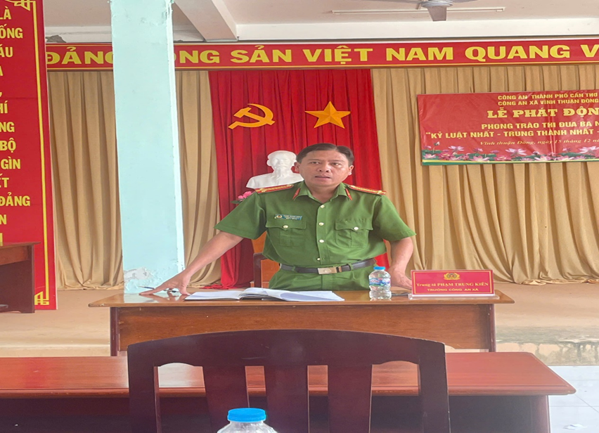 Trung tá Phạm Trung Kiên, Trưởng Công an xã Vĩnh Thuận Đông quán triệt một số nội dung trong Kế hoạch đảm bảo an ninh, trật tự lễ khánh thành