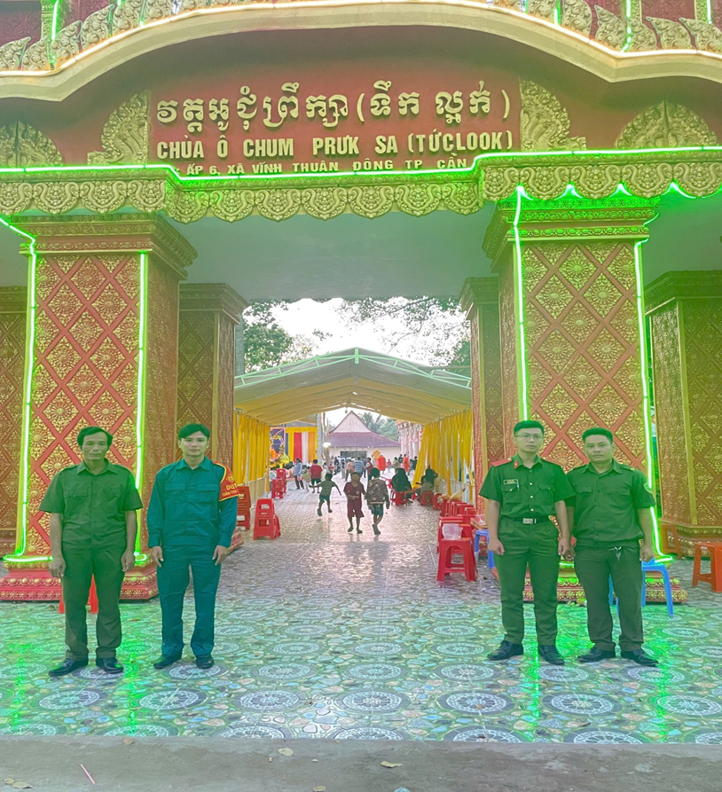 Nhằm bảo đảm an ninh, trật tự, an toàn giao thông và tạo điều kiện thuận lợi cho Nhân dân, phật tử tham dự Lễ khánh thành cổng và các hạng mục công trình tại chùa Ô Chum Prức Sa, diễn ra từ ngày 10/01 đến ngày 12/01/2026, Công an xã Vĩnh Thuận Đông đã chủ động xây dựng và triển khai phương án bảo vệ chặt chẽ, đồng bộ, hiệu quả.