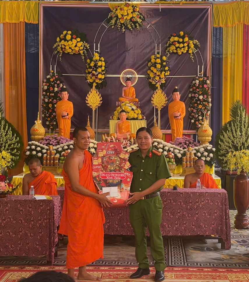 Trung tá Phạm Trung Kiên, Trưởng Công an xã tặng quà chúc mừng Lễ Khánh thành đến Ban Quản trị chùa Ô Chum Prức Sa.