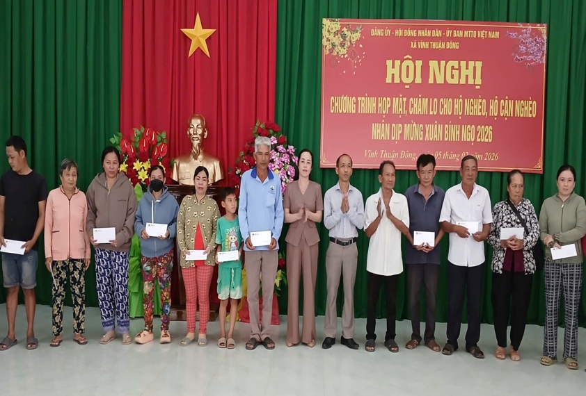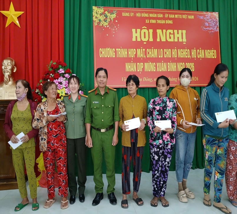 Hưởng ứng phong trào “Cả nước chung tay vì người nghèo - Không ai bị bỏ lại phía sau”, với mong muốn mang đến một cái Tết ấm áp, nghĩa tình cho các hộ gia đình có hoàn cảnh khó khăn, ngày 05/02/2026, Công an xã Vĩnh Thuận Đông đã chủ động tham mưu Đảng ủy, Ủy ban nhân dân xã phối hợp với các ban, ngành, đoàn thể tổ chức Chương trình họp mặt, chăm lo cho hộ nghèo, hộ cận nghèo trên địa bàn nhân dịp Mừng Xuân Bính Ngọ 2026.