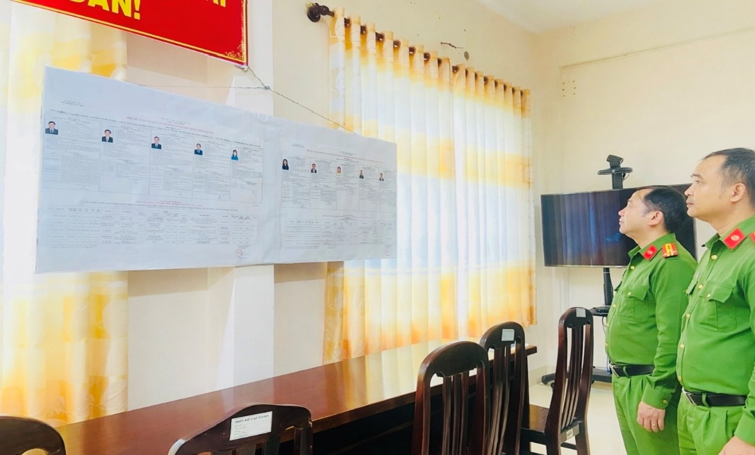 Đồng chí Thượng tá Hoàng Thanh Tuấn, Trưởng Công an xã Vĩnh Viễn kiểm tra công tác PCCC tại điểm bầu cử