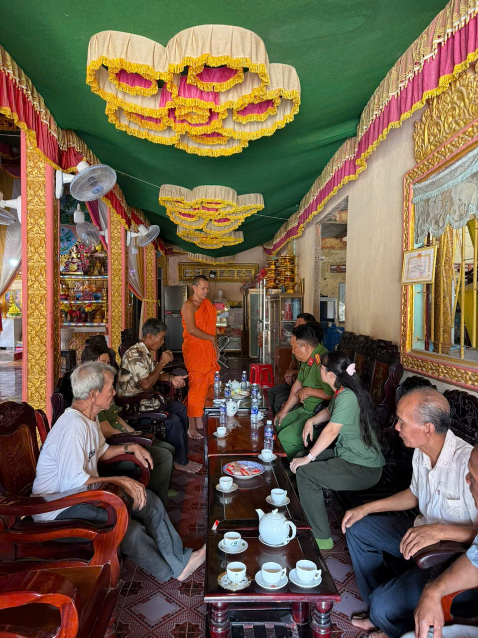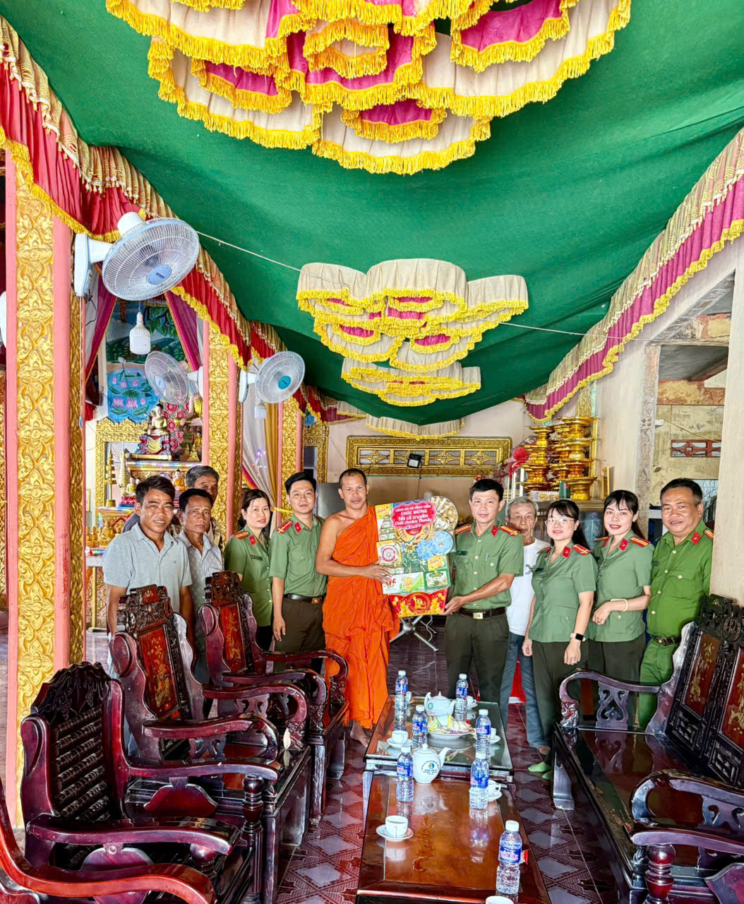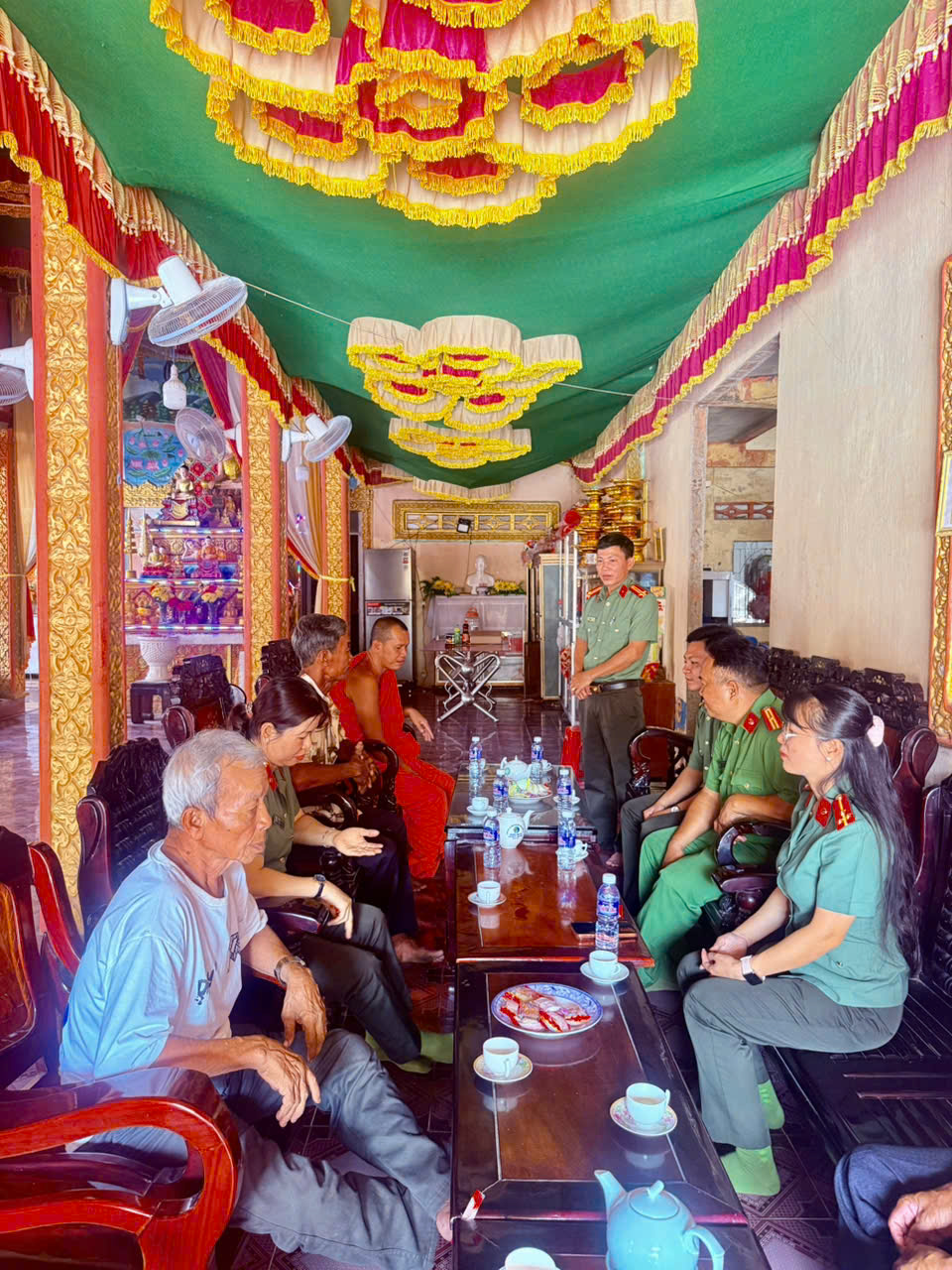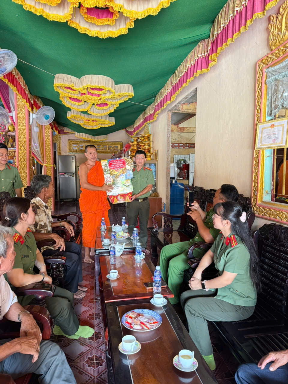 Đồng chí Trung tá Phạm Đình Chiểu, Phó Trưởng Công an xã gửi lời thăm hỏi, chúc mừng đến Trụ trì và Ban Quản trị chùa Săn Kum Mee Chi Đom Ra