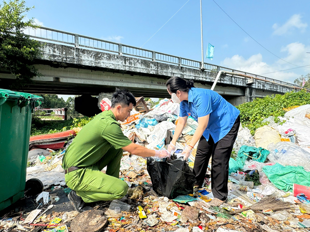 Lực lượng Công an xã Xà Phiên phối hợp thu gom rác thải tự phát tại điểm đen ô nhiễm môi trường.