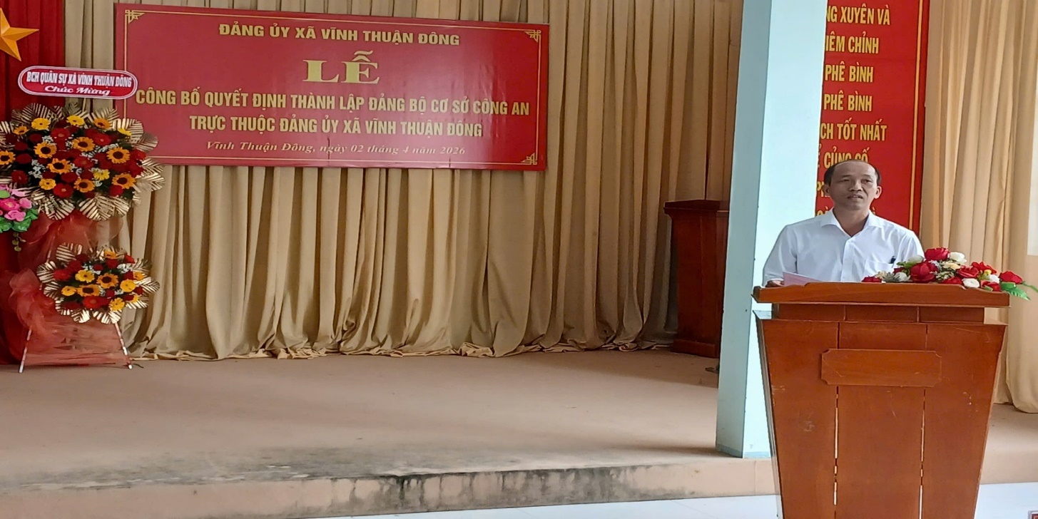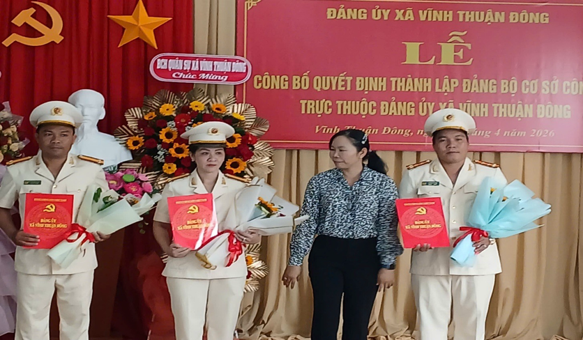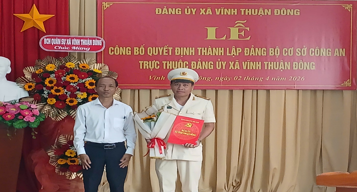 Chiều ngày 02/4/2026, Đảng ủy xã Vĩnh Thuận Đông tổ chức Lễ công bố Quyết định thành lập Đảng bộ cơ sở Công an xã Vĩnh Thuận Đông và chỉ định Ban Chấp hành, Bí thư, Phó Bí thư Đảng bộ nhiệm kỳ 2025 - 2030.