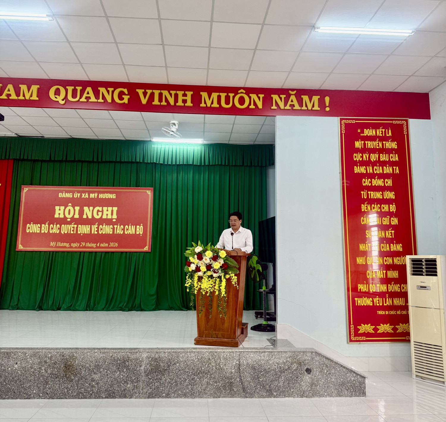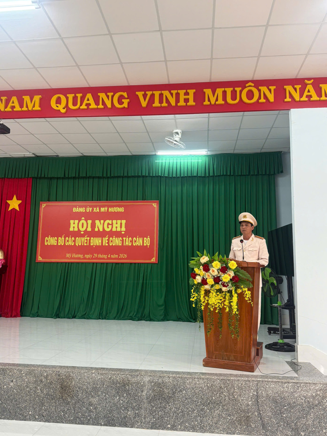 Chiều 29/4/2026, Đảng ủy xã Mỹ Hương long trọng tổ chức Hội nghị công bố Quyết định thành lập Đảng bộ Công an xã Mỹ Hương. Tham dự Hội nghị có đồng chí Nguyễn Văn Út, Phó Bí thư Thường trực Đảng ủy xã; đại diện Hội đồng nhân dân xã; các ban xây dựng Đảng, Văn phòng Đảng ủy xã và toàn thể cán bộ, đảng viên Công an xã.