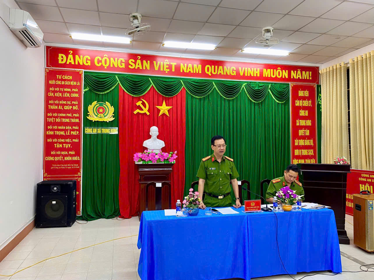 Đại tá Bùi Đức An, Phó Giám đốc Công an thành phố phát biểu chỉ đạo tại buổi làm việc với Công an xã Trung Hưng.