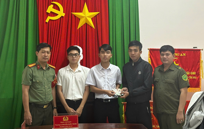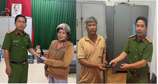 Công an xã Phú Hữu tiếp nhận (bên trái) và trao trả tài sản nhặt được (bên phải) cho người bị đánh mất, góp phần lan tỏa gương người tốt, việc tốt tại địa phương.