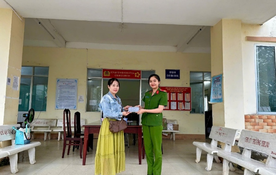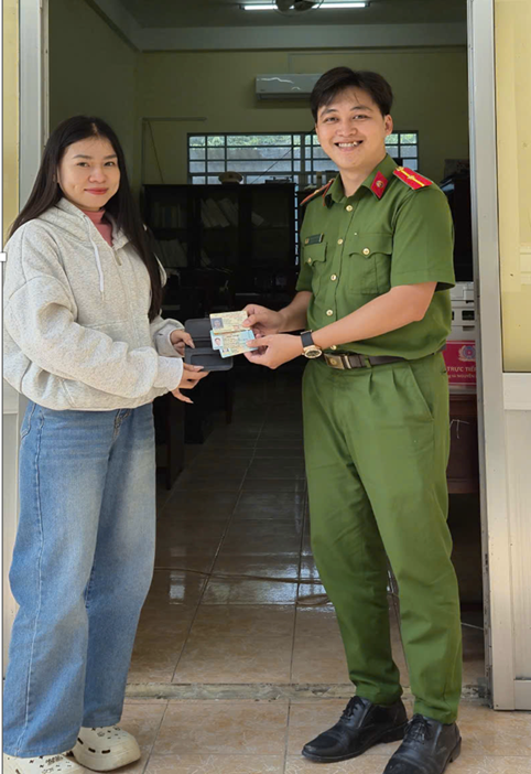 Cán bộ Công an xã Thạnh Xuân hỗ trợ trao trả lại tài sản cho người bị đánh rơi.