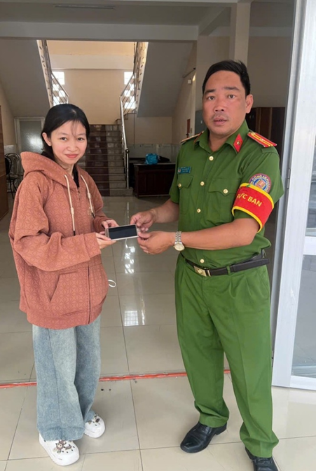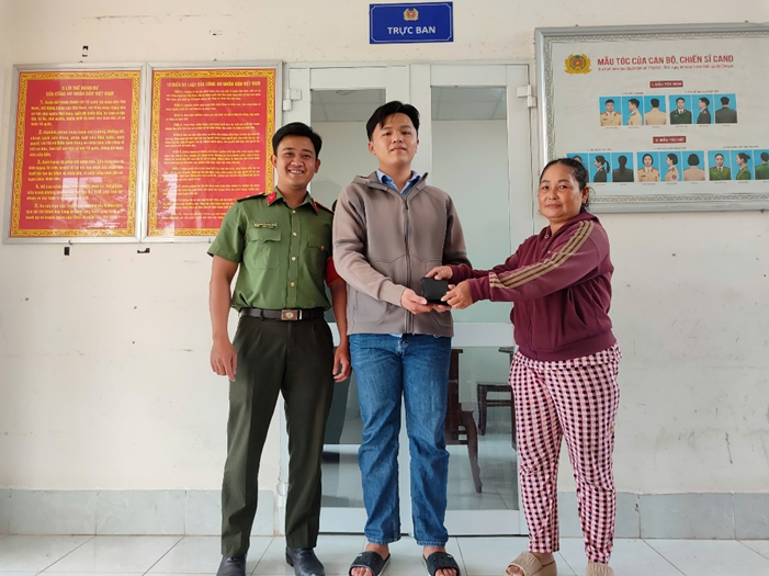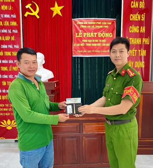 Cán bộ Công an phường Thới An Đông trao trả điện thoại cho người dân bị đánh rơi.