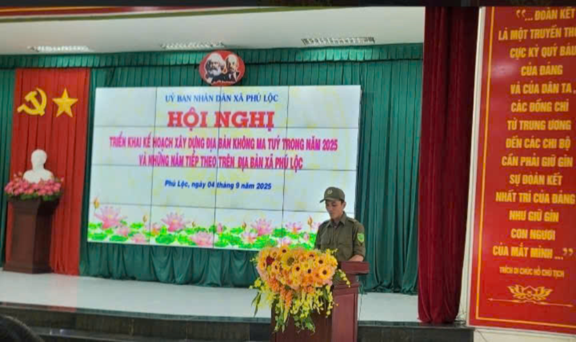 Lực lượng tham gia bảo vệ an ninh, trật tự cơ sở xã Phú Lộc phát biểu tham luận tại Hội nghị triển khai kế hoạch xây dựng địa bàn không ma túy năm 2025 và những năm tiếp theo.