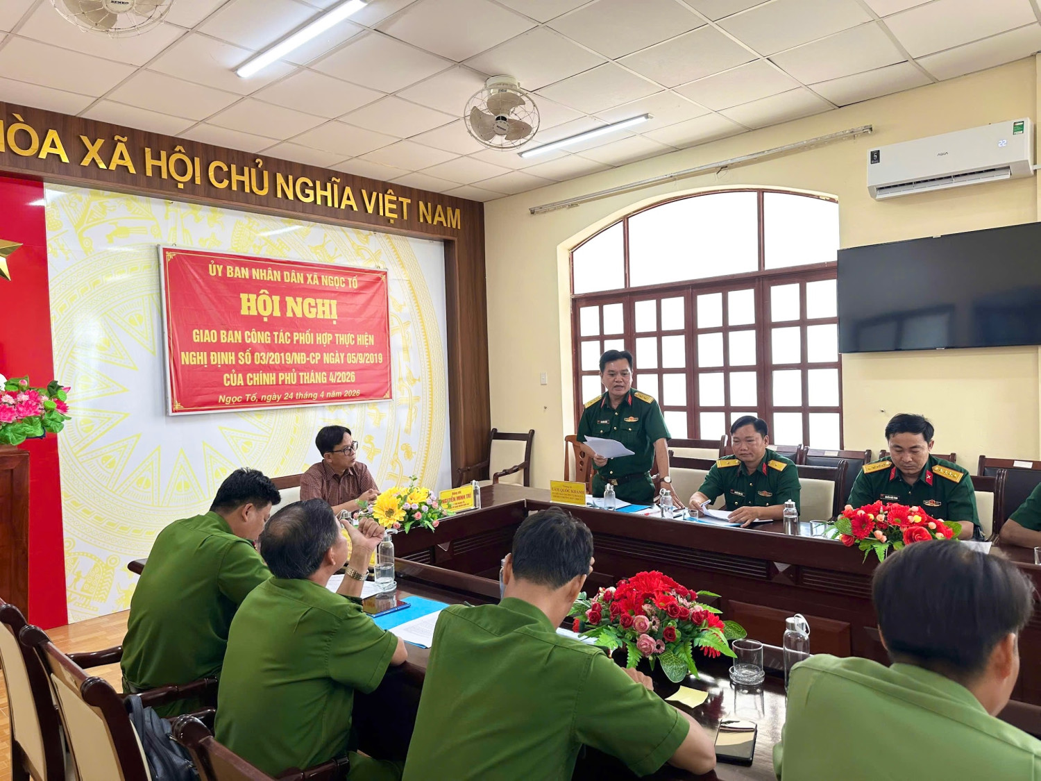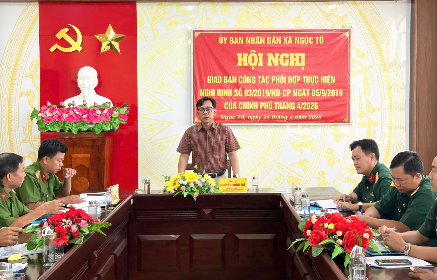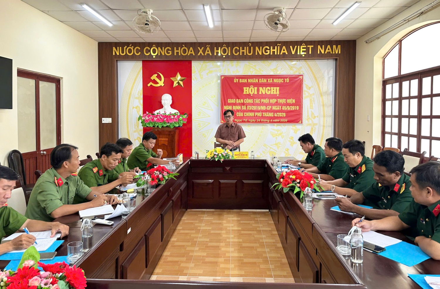 Ủy ban nhân dân xã Ngọc Tố vừa tổ chức Hội nghị giao ban tháng 4/2026 để đánh giá kết quả công tác phối hợp bảo đảm an ninh, trật tự (ANTT) theo Nghị định số 03/2019/NĐ-CP, ngày 05/9/2019 của Chính phủ về phối hợp giữa Bộ Quốc phòng và Bộ Công an trong thực hiện nhiệm vụ bảo vệ an ninh quốc gia, bảo đảm trật tự, an toàn xã hội, đấu tranh phòng, chống tội phạm và nhiệm vụ quốc phòng. Đồng chí Nguyễn Minh Trí, Chủ tịch Ủy ban nhân dân xã chủ trì hội nghị.