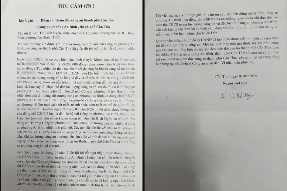 Vừa qua, Giám đốc Công an thành phố Cần Thơ và Công an phường An Bình đã nhận được thư cảm ơn của chị Bùi Thị Bích Ngân (sinh năm 1998, ngụ Khu dân cư Hồng Phát, phường An Bình, TP Cần Thơ) bày tỏ lòng biết ơn sâu sắc đối với lực lượng Công an đã kịp thời hỗ trợ giúp bà nhận lại số tiền chuyển khoản nhầm.