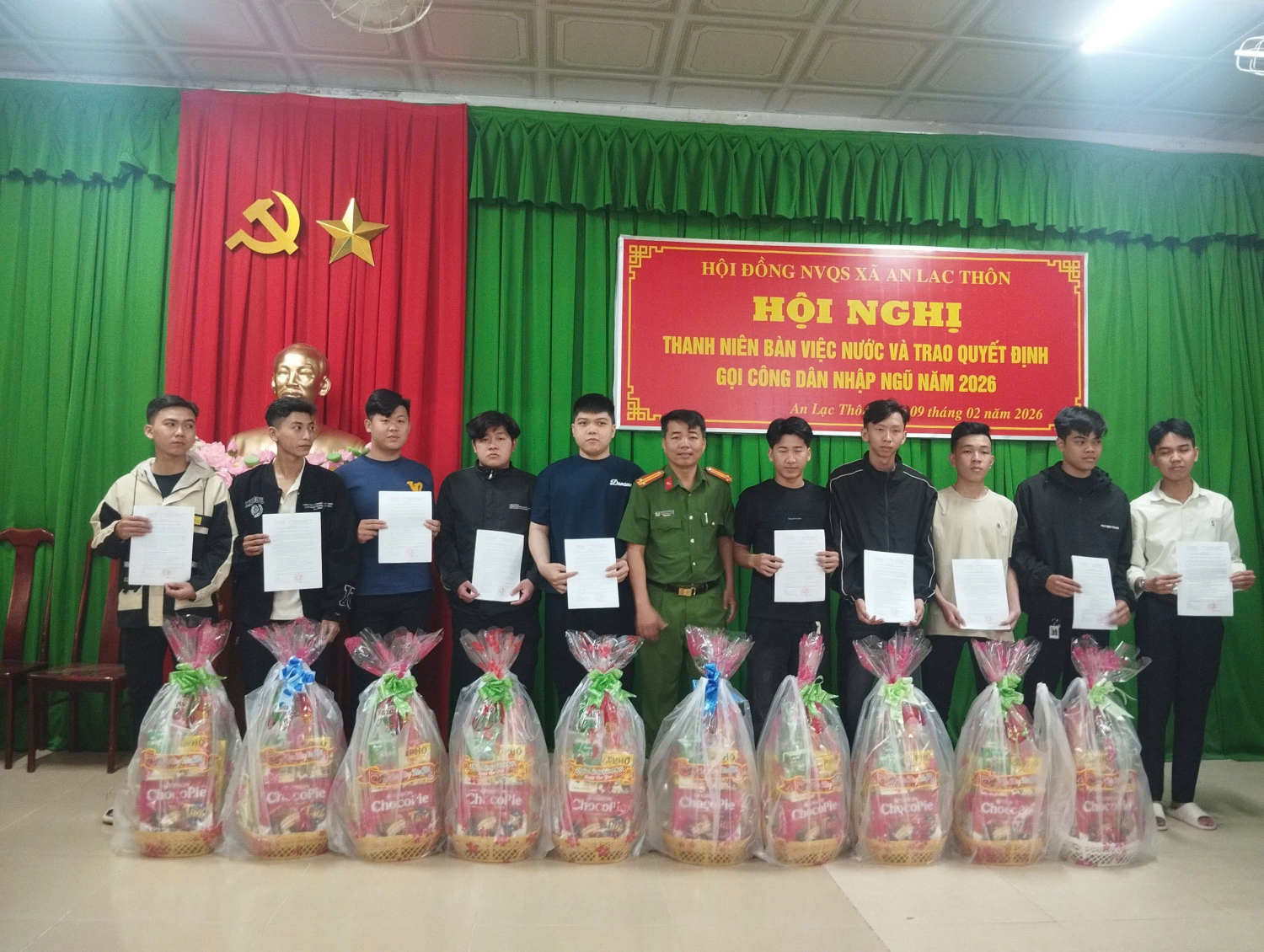 Chỉ huy Công an xã An Lạc Thôn trao Quyết định thực hiện nghĩa vụ tham gia Công an nhân dân năm 2026 cho công dân trúng tuyển.