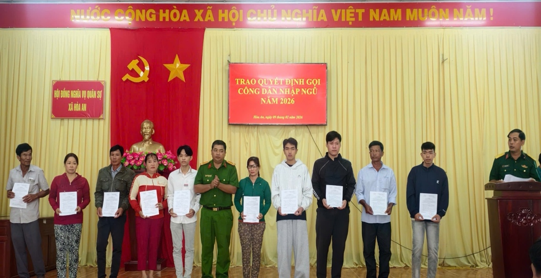 Đại diện Chỉ huy Công an xã Hòa An trao Quyết định gọi công dân thực hiện nghĩa vụ tham gia Công an nhân dân năm 2026 cho các công dân trúng tuyển.
