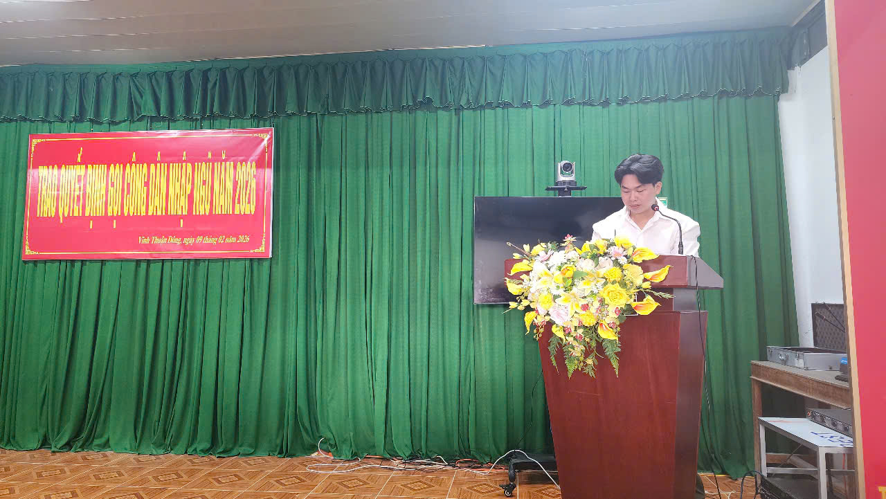 Đại diện thanh niên trúng tuyển nghĩa vụ quân sự năm 2026 phát biểu hạ quyết tâm tại buổi lễ ở Công an xã Vĩnh Thuận Đông.