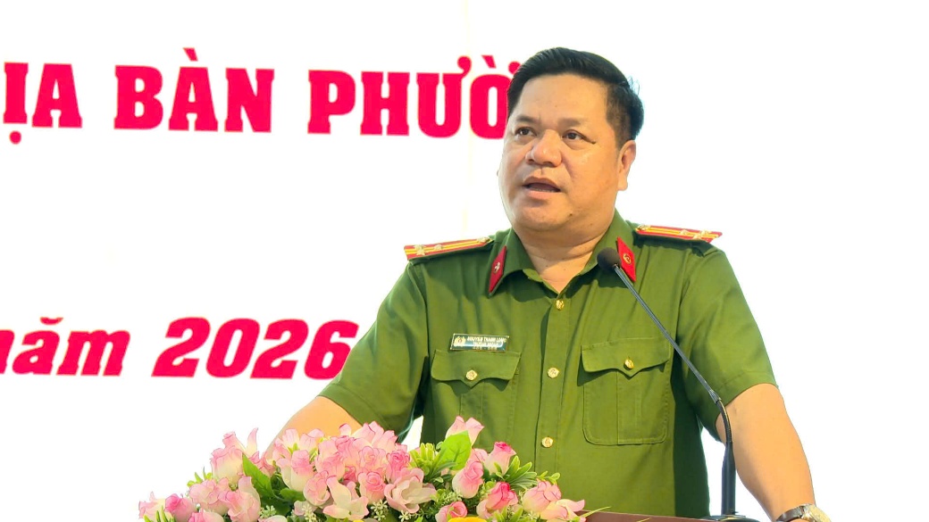 Đồng chí Thượng tá Nguyễn Thanh Long, Trưởng phòng PC04 – Công an thành phố Cần Thơ phát biểu tại hội nghị