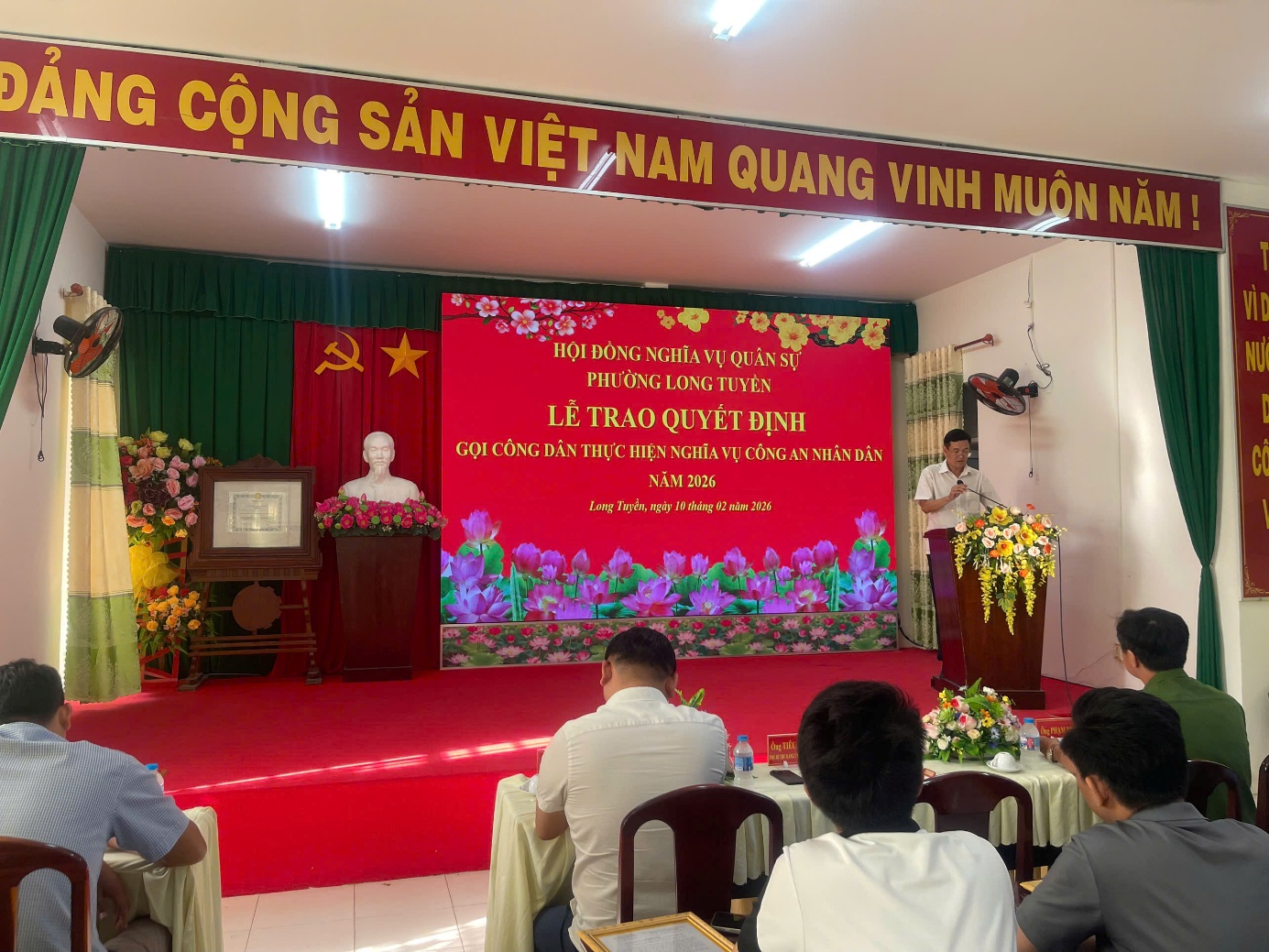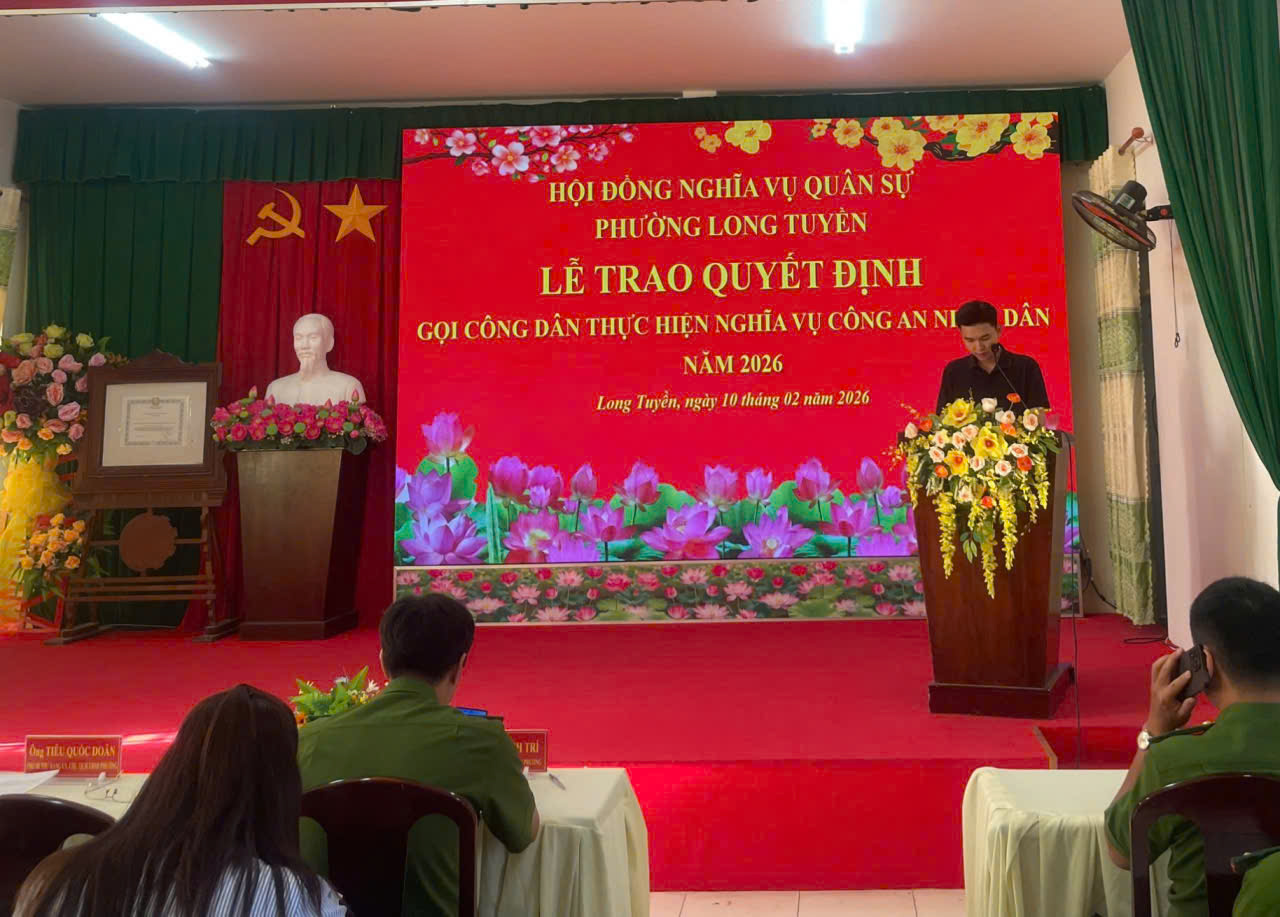 Trong không khí phấn khởi của những ngày đầu Xuân Bính Ngọ năm 2026, hòa cùng khí thế thi đua sôi nổi của toàn Đảng, toàn quân và toàn dân ra sức lập thành tích chào mừng thành công Đại hội XIV của Đảng, tiến tới bầu cử Đại biểu Quốc hội khóa XVI, đại biểu Hội đồng nhân dân các cấp nhiệm kỳ 2026-2031. Ngày 10/02/2026, Hội đồng Nghĩa vụ quân sự phường Long Tuyền long trọng tổ chức Lễ trao Quyết định gọi công dân thực hiện nghĩa vụ tham gia Công an nhân dân (CAND) năm 2026.