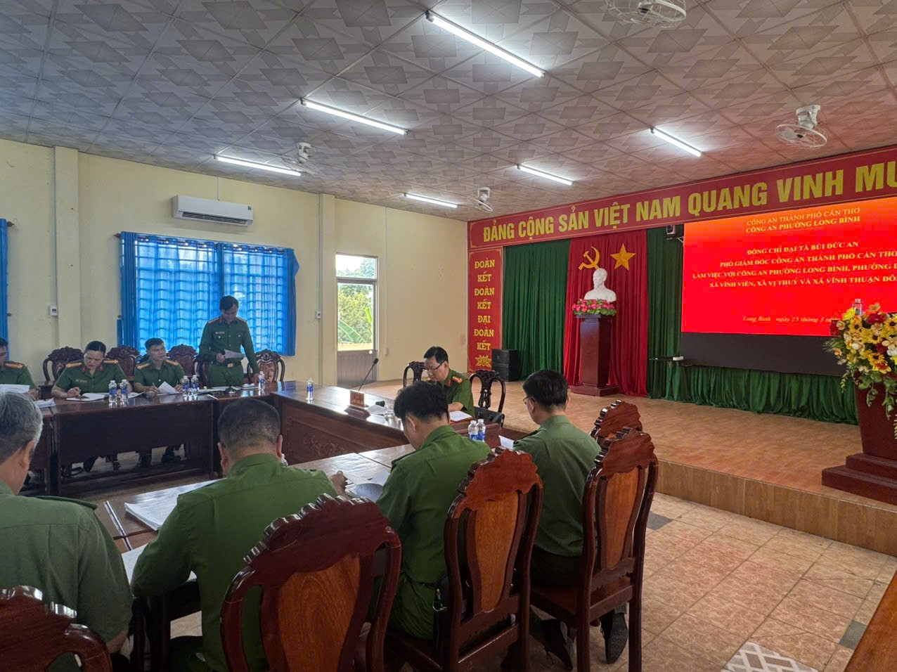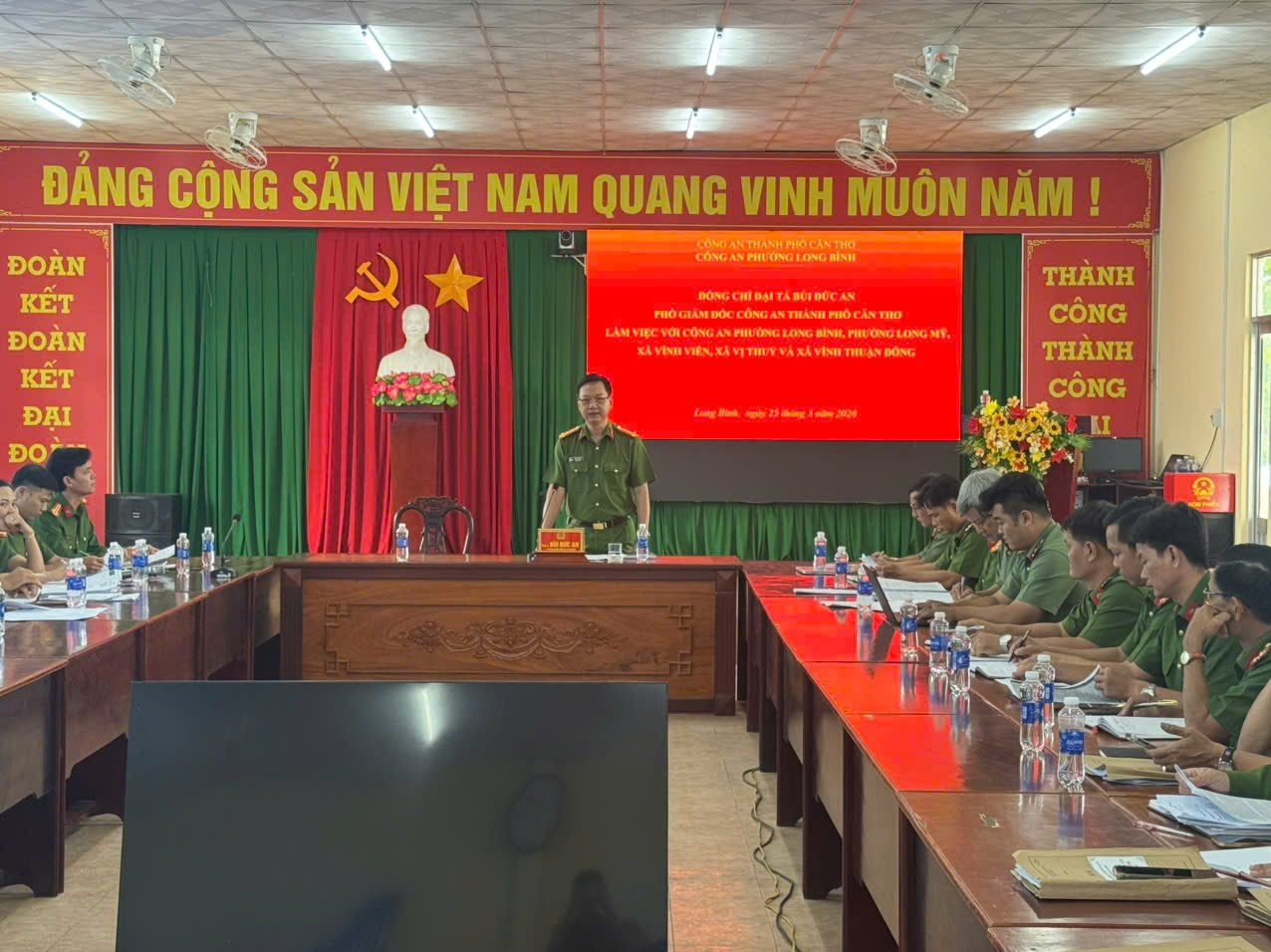 Chiều ngày 25/3/2026, Đoàn công tác Công an thành phố Cần Thơ do Đại tá Bùi Đức An – Phó Giám đốc Công an thành phố làm Trưởng đoàn đã tiến hành kiểm tra toàn diện các mặt công tác tại Công an phường Long Bình. Tham dự buổi làm việc còn có đại diện Công an các xã, phường giáp ranh. Nội dung kiểm tra tập trung vào việc siết chặt kỷ luật, kỷ cương, triển khai các giải pháp đột phá nhằm duy trì vững chắc “Phường không ma túy”.