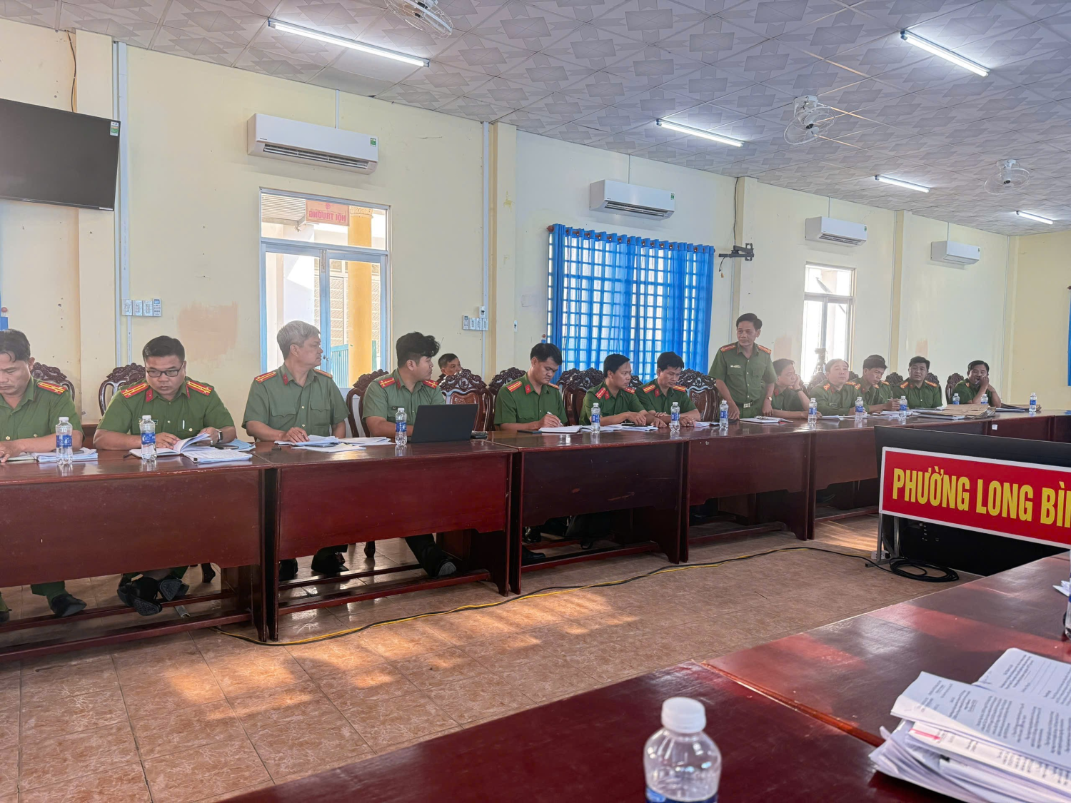 Đồng chí Trung ta Phạm Hoàng Ân – Trưởng Công an phường Long Bình báo cáo kết qủa thực hiện các mặt công tác Công an của đơn vị cho Lãnh đạo Công an thành phố