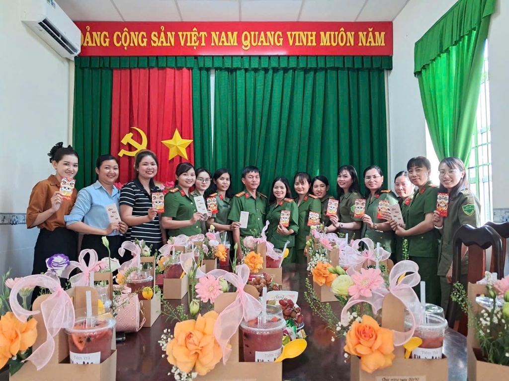 Ban chỉ huy Công an xã Hiệp Hưng trao tặng hoa và quà đến cán bộ, chiến sĩ nữ Công an xã