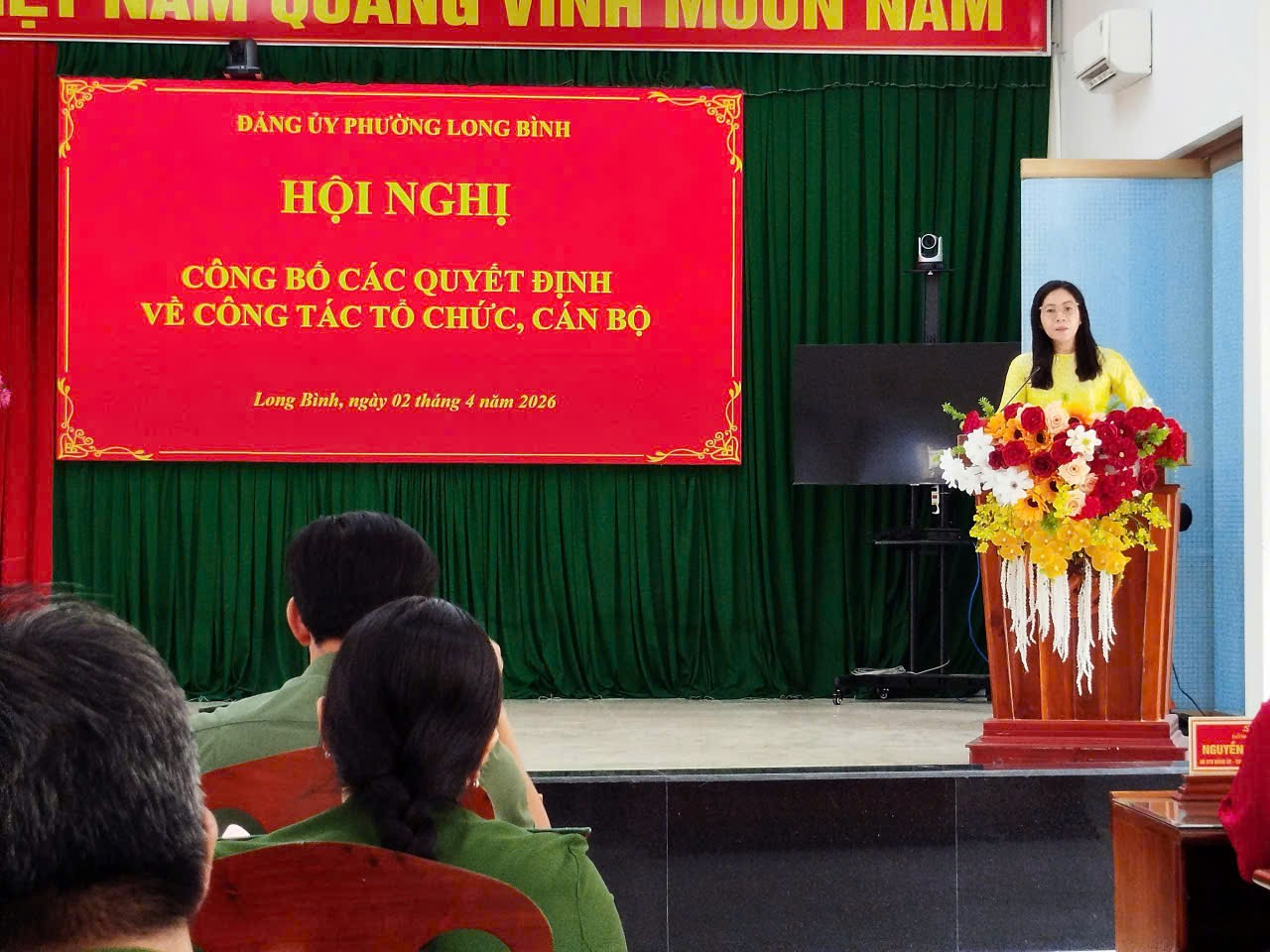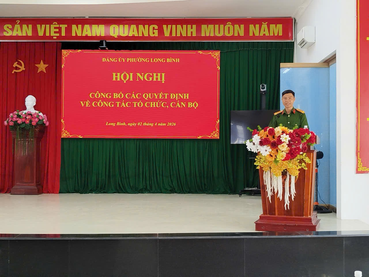 Sáng ngày 02/4/2026, Đảng ủy phường Long Bình đã tổ chức Hội nghị công bố Quyết định thành lập Đảng bộ cơ sở Công an phường. Đây là bước ngoặt quan trọng nhằm kiện toàn tổ chức, nâng cao năng lực lãnh đạo của lực lượng Công an trong tình hình mới.