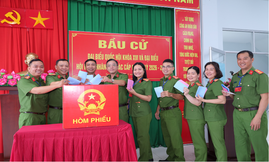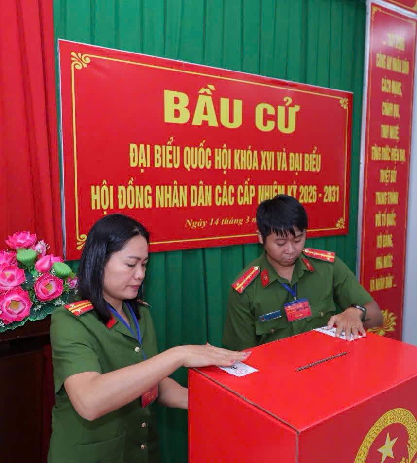 Ảnh: Cán bộ, chiến sĩ Công an phường nhận phiếu bầu cử Hội đồng nhân dân các cấp nhiệm kỳ 2026-2031