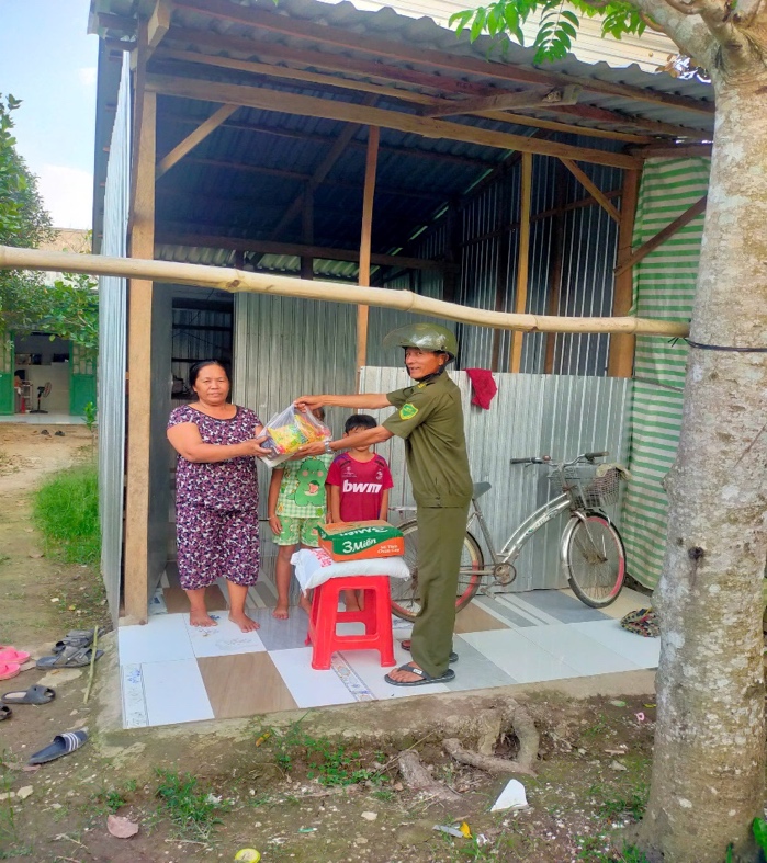 Lực lượng tham gia bảo vệ an ninh, trật tự ở cơ sở trao quà cho Nhân dân có hoàn cảnh khó khăn.