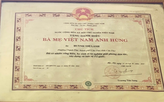 Qua hai cuộc chiến tranh ác liệt của dân tộc Việt Nam, có biết bao người con đã ngã xuống vì Tổ quốc. Họ là niềm tự hào, niềm tin và lẽ sống của những người mẹ tảo tần sớm hôm, sẵn sàng hy sinh “núm ruột” của mình để giành lại tự do cho dân tộc. Nhân dịp kỷ niệm 81 năm ngày thành lập Quân đội Nhân dân Việt Nam (22/12/1944 - 22/12/2025), Hội phụ nữ cơ sở và Chi đoàn cơ sở Phòng Tổ chức cán bộ đã đến thăm hỏi và tặng quà cho Mẹ Việt Nam anh hùng Huỳnh Thị Lành, 93 tuổi sống tại phường An Bình, thành phố Cần Thơ,Mẹ có người con trai anh Nguyễn Văn Tây đã anh dũng hy sinh trong cuộc kháng chiến chống Mỹ cứu nước, bày tỏ lòng tri ân đối với những hy sinh cao cả của Mẹ vì nền độc lập tự do của Tổ Quốc.