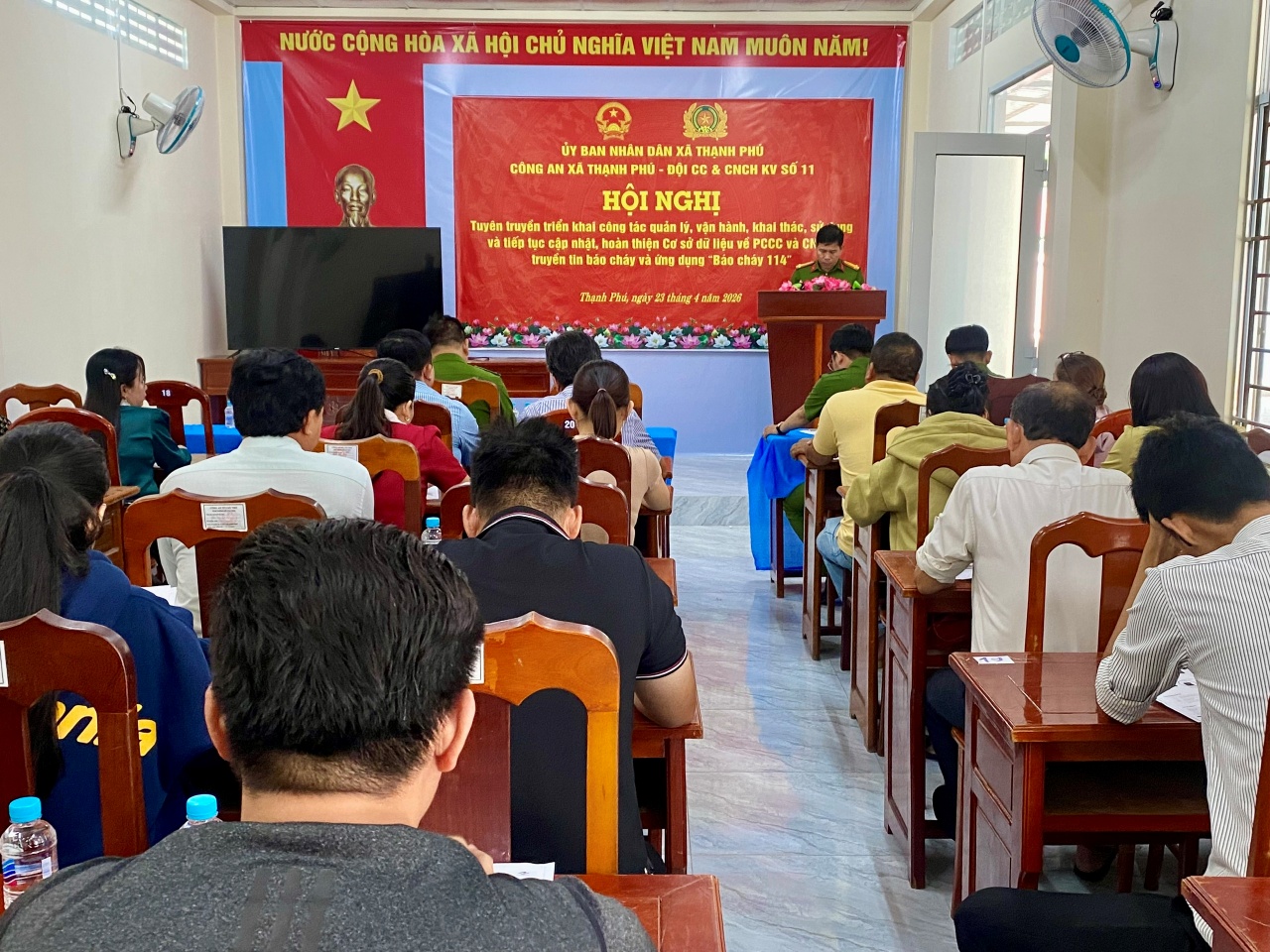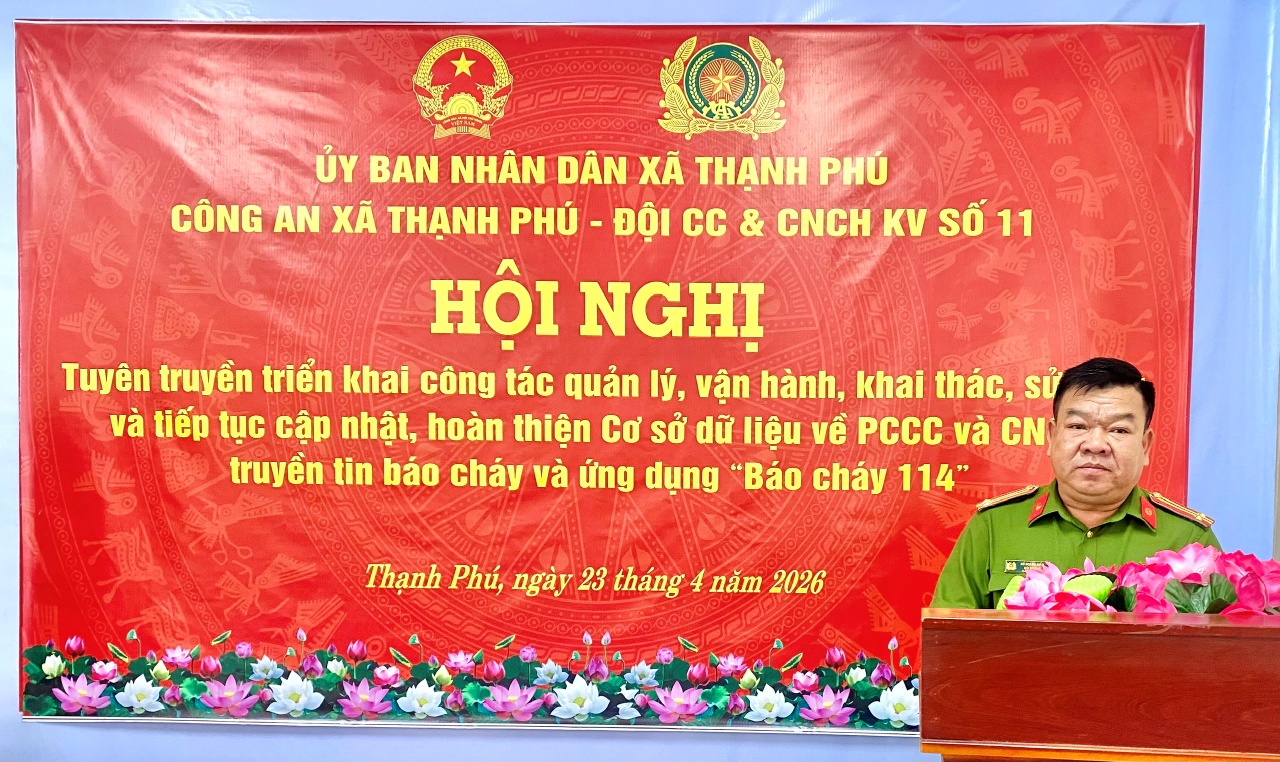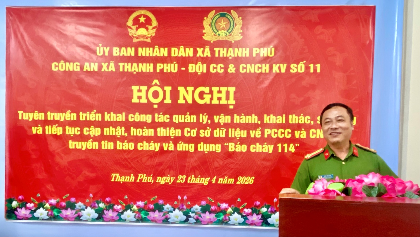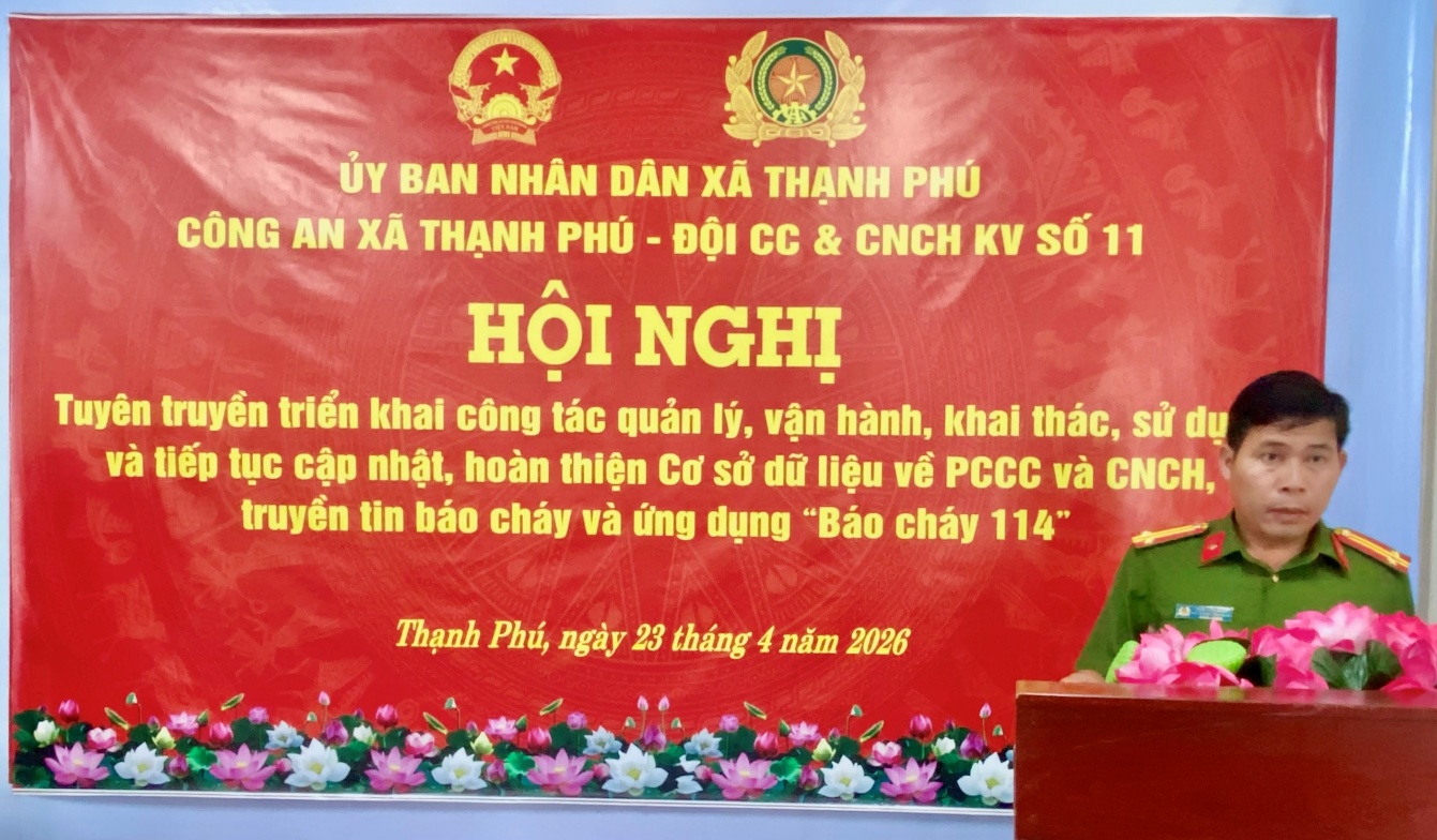 Thực hiện Kế hoạch của Ủy ban nhân dân thành phố và Công an thành phố Cần Thơ về triển khai công tác quản lý, vận hành, khai thác, sử dụng và tiếp tục cập nhật, hoàn thiện Cơ sở dữ liệu về phòng cháy, chữa cháy (PCCC) và cứu nạn, cứu hộ (CNCH), truyền tin báo cháy và ứng dụng “Báo cháy 114”. Ngày 23/04/2026, Công an xã Thạnh Phú phối hợp Đội Chữa cháy và CNCH khu vực số 11 tổ chức hội nghị tuyên truyền triển khai công tác quản lý, vận hành, khai thác, sử dụng và tiếp tục cập nhật, hoàn thiện Cơ sở dữ liệu về PCCC và CNCH, truyền tin báo cháy và ứng dụng “Báo cháy 114” cho đại diện các cơ sở thuộc diện quản lý PCCC trên địa bàn xã Thạnh Phú.