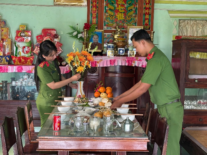 Tại nhà của chú Sáu (nơi thờ cúng Mẹ Lê Thị Đâu), trong không khí ấm áp nghĩa tình, đoàn viên, thanh niên Chi đoàn Công an xã cùng đại diện Hội phụ nữ và Đoàn thanh niên xã dọn dẹp nhà cửa, sắp xếp đồ đạc, chuẩn bị mâm cơm cúng. Lãnh đạo Đảng ủy, UBND xã, Chỉ huy Công an xã, Đoàn thanh niên, Hội phụ nữ xã cùng Chi đoàn Công an xã thành kính thắp hương tưởng niệm Mẹ và các anh hùng liệt sĩ đã hy sinh.