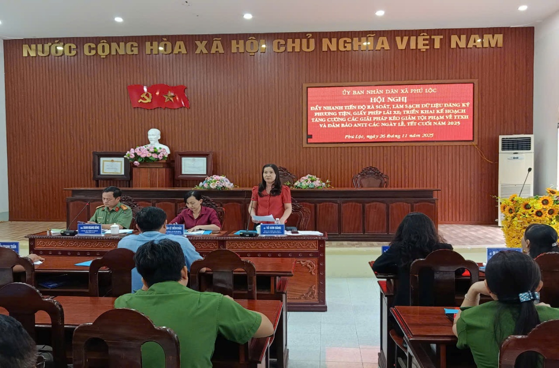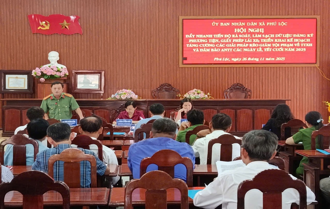 Ngày 26/11/2025, Công an xã Phú Lộc đã tham mưu Ủy ban nhân dân xã tổ chức Hội nghị đánh giá kết quả tổng rà soát và làm sạch dữ liệu đăng ký phương tiện, giấy phép lái xe, đồng thời triển khai kế hoạch tăng cường các giải pháp phòng ngừa tội phạm về trật tự xã hội, đảm bảo an ninh, trật tự các ngày lễ, tết cuối năm 2025.
