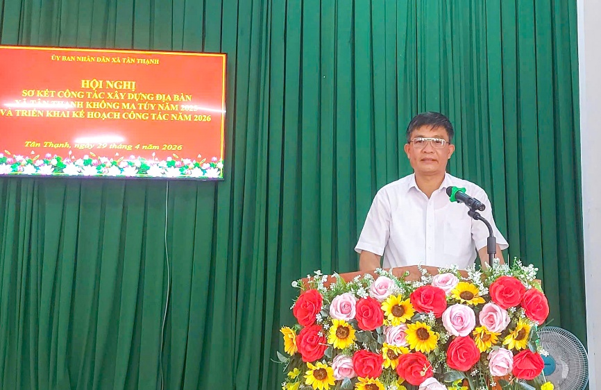 Chiều ngày 29/4, Công an xã Tân Thạnh tham mưu Ủy ban nhân dân xã tổ chức Hội nghị sơ kết công tác xây dựng địa bàn “xã không ma túy” năm 2025 và triển khai phương hướng, nhiệm vụ năm 2026.