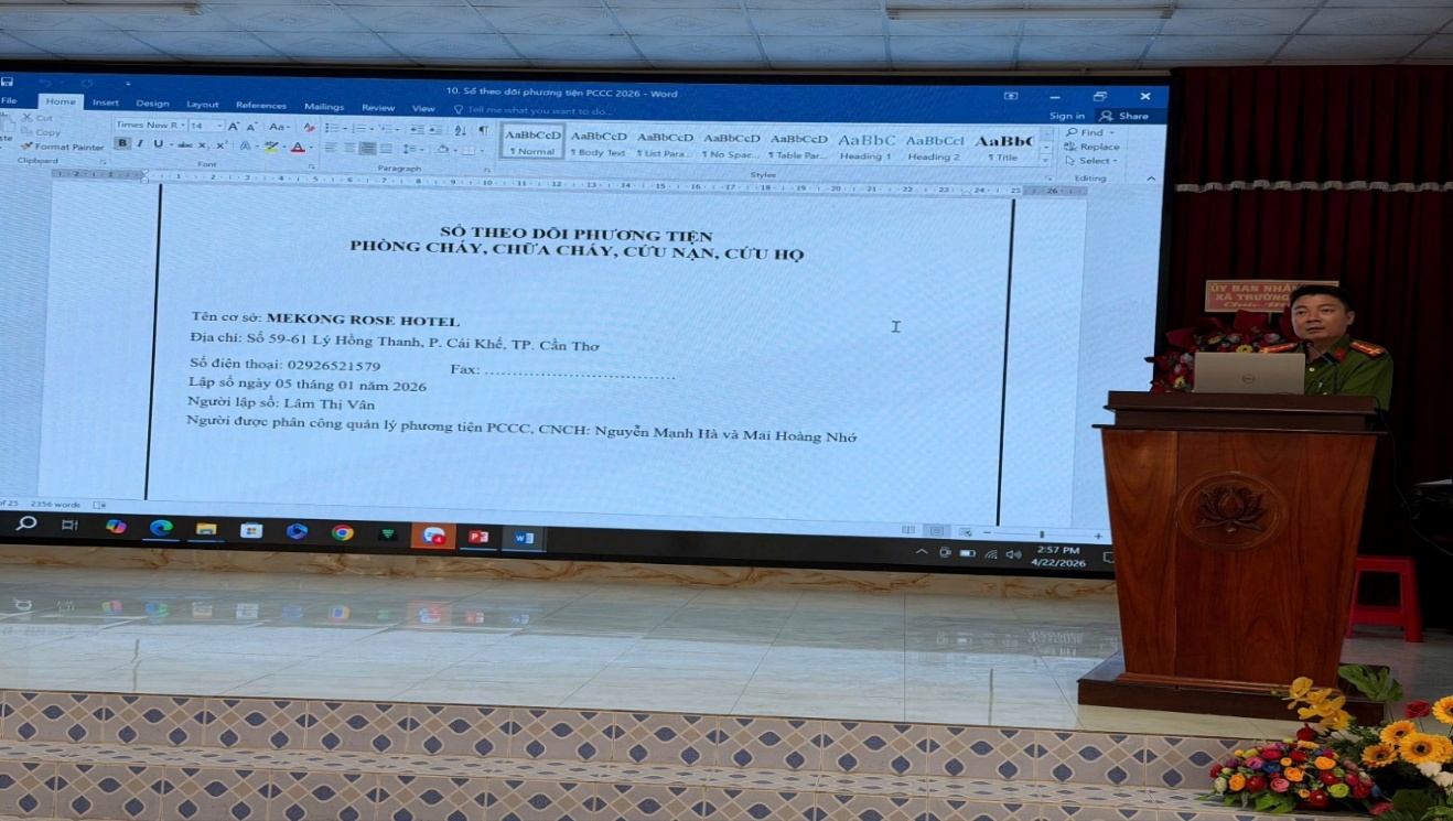 Chiều ngày 22/4/2026, Ủy ban nhân dân xã phối hợp Phòng Cảnh sát phòng cháy, chữa cháy và cứu nạn cứu hộ Công an thành phố Cần Thơ tổ chức Hội nghị hướng dẫn cơ sở hồ sơ về phòng cháy, chữa cháy và cứu nạn cứu hộ, khai báo, cập nhật thông tin cơ sở thuộc diện quản lý về phòng cháy chữa cháy phục vụ xây dựng cơ sở dữ liệu quốc gia về phòng cháy, chữa cháy; trang bị và kết nối thiết bị truyền tin báo cháy cho các cơ sở thuộc diện quản lý về phòng cháy, chữa cháy có trách nhiệm trang bị, kết nối thiết bị truyền tin báo cháy với hệ thống Cơ sở dữ liệu quốc gia về phòng cháy, chữa cháy và cứu nạn cứu hộ; đồng thời thực hiện khai báo, cập nhật thông tin đầy đủ, chính xác về công tác phòng cháy, chữa cháy, cứu nạn, cứu hộ. Tham dự Hội nghị có đồng chí Nguyễn Thanh Truyền, Phó Chủ tịch Ủy ban nhân dân xã Trường Long, đại diện Phòng Cảnh sát phòng cháy, chữa cháy và cứu nạn cứu hộ, đại diện Công an xã Trường Long cùng đại diện các cơ sở kinh doanh trên địa bàn.