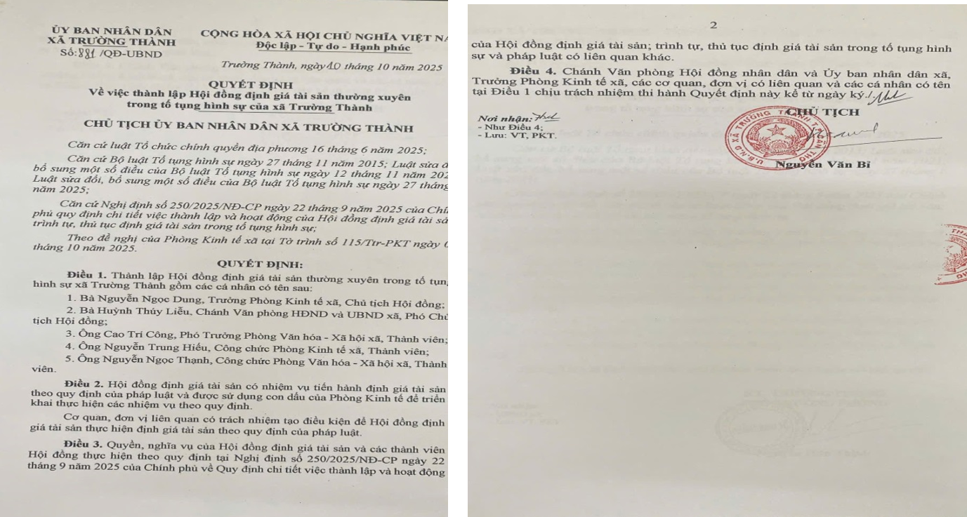 Ngay sau khi Nghị định số 250/2025/NĐ-CP ngày 22/09/2025 có hiệu lực, Công an xã Trường Thành đã chủ động nghiên cứu và kiến nghị UBND xã xem xét thành lập Hội đồng định giá tài sản trong tố tụng hình sự. Hội đồng chính thức đi vào hoạt động từ ngày 10/10/2025, góp phần giải quyết nhanh chóng các nguồn tin tố giác, tin báo về tội phạm, kiến nghị khởi tố và điều tra vụ án hình sự.