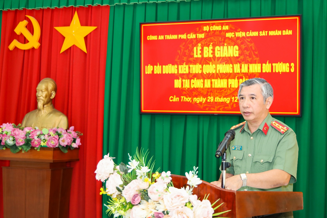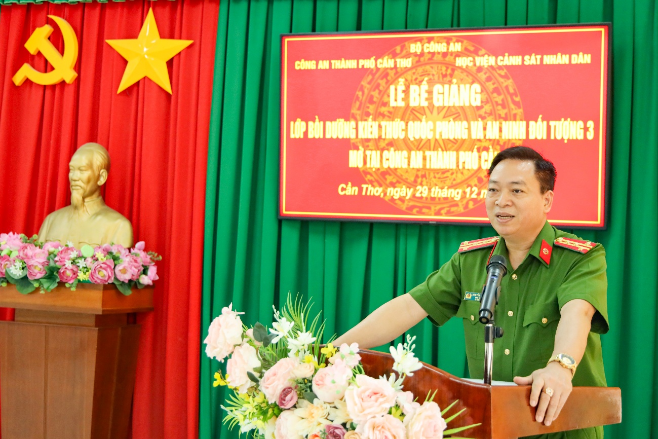 Thay mặt Đảng ủy, Ban Giám đốc Công an TP Cần Thơ, Đại tá Huỳnh Hoài Hận, Ủy viên BTV Đảng ủy, Phó Giám đốc Công an thành phố nhấn mạnh lớp Bồi dưỡng kiến thức quốc phòng và an ninh đối tượng 3 được tổ chức trong thời điểm có ý nghĩa đặc biệt, đáp ứng yêu cầu nâng cao chất lượng đội ngũ cán bộ lãnh đạo, chỉ huy trong bối cảnh nhiệm vụ bảo đảm an ninh, trật tự ngày càng toàn diện và nặng nề. Thông qua khóa học, các học viên đã được bổ sung, cập nhật những nội dung cốt lõi về quốc phòng - an ninh, nâng cao tư duy chiến lược, khả năng tham mưu, chỉ đạo và tổ chức thực hiện nhiệm vụ tại cơ quan, đơn vị, địa phương. Đồng thời, đồng chí đã biểu dương tinh thần học tập nghiêm túc, trách nhiệm, kỷ luật của các học viên; đồng thời đề nghị tiếp tục phát huy kết quả đạt được, vận dụng linh hoạt kiến thức vào thực tiễn công tác, chủ động tham mưu các giải pháp bảo đảm quốc phòng - an ninh, góp phần xây dựng thế trận an ninh nhân dân, “thế trận lòng dân” ngày càng vững chắc.
