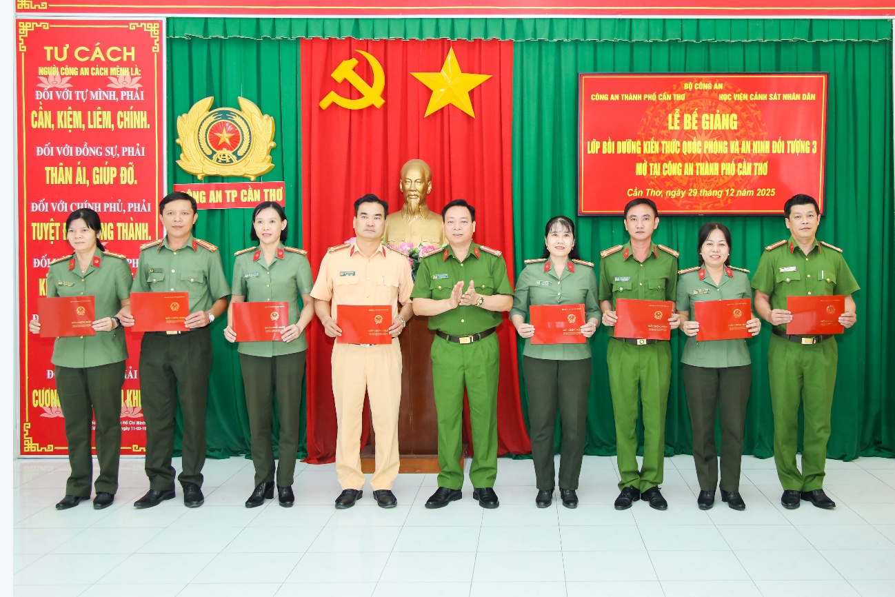 Sáng 29/12, Học viện Cảnh sát nhân dân phối hợp Công an thành phố Cần Thơ tổ chức Lễ Bế giảng lớp Bồi dưỡng kiến thức quốc phòng và an ninh đối tượng 3 mở tại Công an TP Cần Thơ. Dự lễ có Đại tá - PGS.TS Nguyễn Đăng Sáu, Phó Giám đốc Học viện Cảnh sát nhân dân; Đại tá Huỳnh Hoài Hận, Ủy viên BTV Đảng ủy, Phó Giám đốc Công an TP Cần Thơ, cùng đại diện các khoa, phòng chức năng và toàn thể học viên lớp bồi dưỡng
