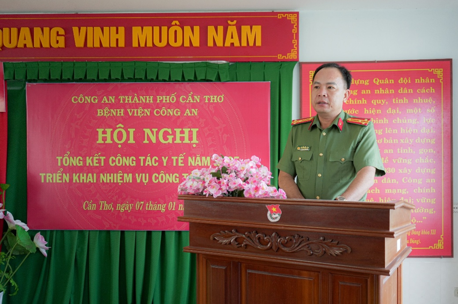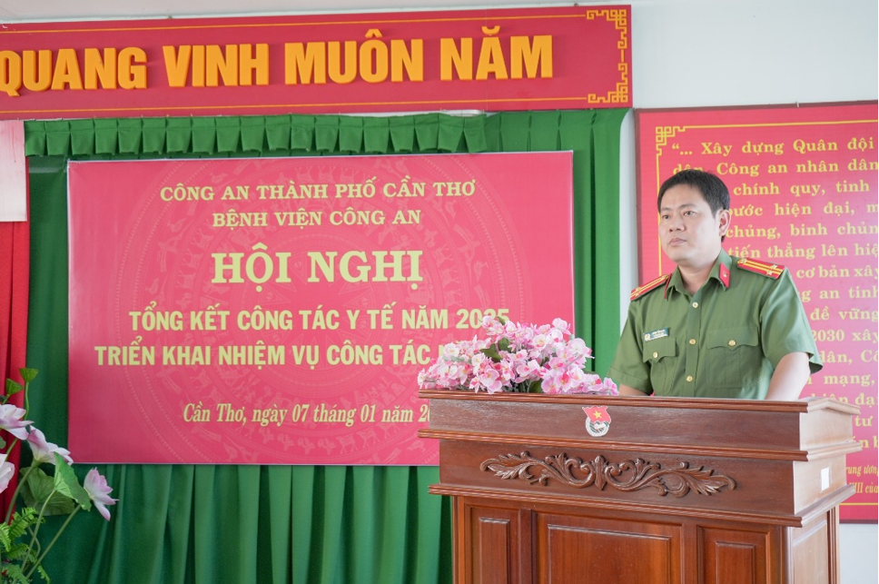 Phát biểu chỉ đạo tại hội nghị, Trung tá Đinh Tùng An, Ủy viên Ban Thường vụ Đảng ủy, Phó Giám đốc Công an thành phố ghi nhận kết quả, thành tích Bệnh viện Công an thành phố đạt được trong năm 2025, đồng thời chỉ ra một số tồn tại cần khắc phục. Thời gian tới, đồng chí Phó Giám đốc đề nghị lãnh đạo Bệnh viện tập trung bám sát, thực hiện tốt Nghị quyết, Chỉ thị, văn bản chỉ đạo của Đảng ủy Công an Trung ương, lãnh đạo Bộ Công an và Đảng ủy, Ban Giám đốc Công an thành phố, nhất là các Đề án phát triển mạng lưới y tế Công an nhân dân đến năm 2030, Đề án Nâng cao năng lực dự phòng, khám chữa bệnh và chăm sóc sức khỏe của Y tế Công an nhân dân bảo đảm công tác chiến đấu của lực lượng Công an trong tình hình mới; ưu tiên tập trung phát triển nguồn nhân lực, tạo điều kiện cho đội ngũ y, bác sĩ được đào tạo nâng cao trình độ, tay nghề; tiếp tục phát huy tinh thần đoàn kết; làm tốt công tác tham mưu, đề xuất triển khai phương án đầu tư, mua sắm trang thiết bị, phương tiện y tế hiện đại, thiết thực, hiệu quả đáp ứng nhu cầu khám, chữa bệnh không chỉ trong lực lượng mà sẵn sàng phục vụ người dân...